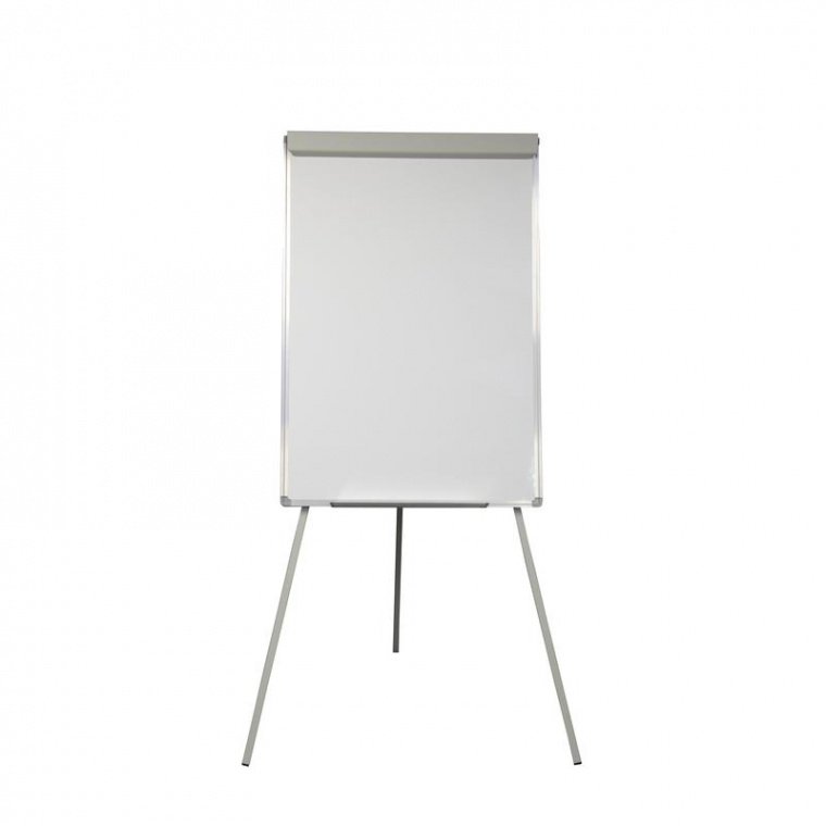 Мобильный флипчарт на треноге с маркерным покрытием. Высота регулируется, треноги имеют специальные винты, которые закручиваются на креплениях у ножек и можно регулировать высоту, до 180 см высота флипчарта (в полностью разложенном виде — чуть ниже, так как ноги будут под наклоном (около 170–175), минимальная высота не указывается так как ноги можно убрать заподлицо флипчарта. Предназначен для работ маркерами сухого стирания. Оснащен держателем для бумажного блокнота. Флипчарт, на который монтируется доска, выполнены из профиля прямоугольного сечения. Алюминиевая рама. На стойку нанесена порошковая покраска серого цвета. В комплект входит полочка для маркеров. Расширение треноги — 64 см.