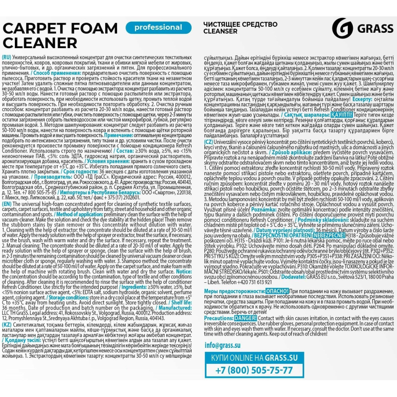 Средство для пенной очистки ковровых покрытий Grass Carpet Foam Cleaner 5.4 кг (концентрат) Назначение. Универсальный высокопенный концентрат для очистки синтетических текстильных поверхностей, ковров, ковровых покрытий, ткани и обивки мягкой мебели от жировых, улично-бытовых, и др. органических загрязнений и пятен. В концентрированном виде применяется как пятновыводитель. Не разрушает синтетические волокна, не оставляет разводов и сохраняет цветовую гамму. Устраняет неприятные запахи. Для профессионального применения. Способ применения. Предварительно очистить поверхность с помощью пылесоса. Приготовить раствор и проверить стойкость красителя ткани на незаметном участке! Затем удалить сложные пятна пятновыводителем или данным концентратом, не разбавляя его с водой. 1.Очистка с помощью экстрактора: концентрат разбавить из расчета 30-50 мл/л воды. Нанести готовый раствор с помощью распылителя или экстрактора, обработать поверхность, при необходимости использовать щетку, промыть теплой водой и высушить поверхность. При необходимости повторить обработку. 2. Очистка ручным способом: концентрат разбавить из расчета 20-30 мл/л воды, нанести готовый раствор с помощью распылителя или губки, очистить поверхность с помощью щетки, через 2-3 минуты остатки загрязнения собрать пылеводососом или чистой микрофиброй, губкой, регулярно промывая водой. 3.Методом шампунирования: концентрат следует разбавить из расчета 50-100 мл/л воды, нанести на поверхность ковра и вспенить с помощью щетки роторной машины. Промыть. Состав: 30% вода, 5%, но