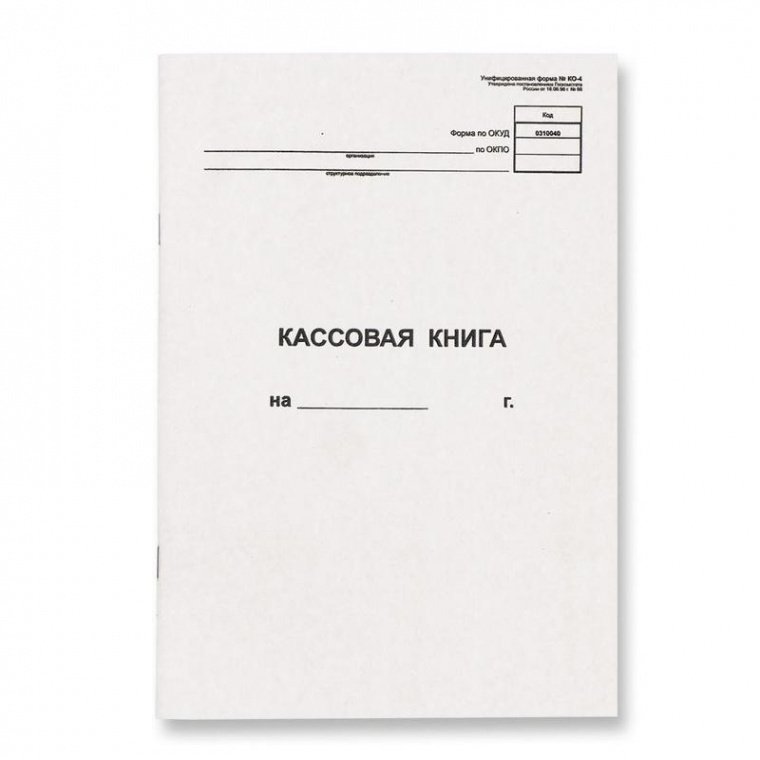 Бухгалтерская кассовая книга формы NКО-4 (формат А4, вертикальная). Обложка изготовлена из картона. Внутренний блок — газетная бумага, 48 листов. Способ крепления — скрепки.