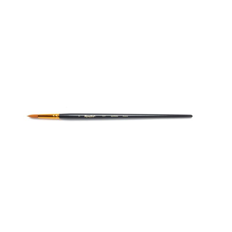 Кисть круглая из волоса рыжей жесткой синтетики с укороченной выставкой, обойма алюминиевая, анодированная, ручка длинная, черная, матовая. Номера 00-3 используются для нанесения бликов и очень мелких деталей, 4-10 для нанесения фона и больших деталей. Серийно выпускаются: 00; 0; 1; 2; 3; 4; 5; 6; 7; 8; 9; 10.