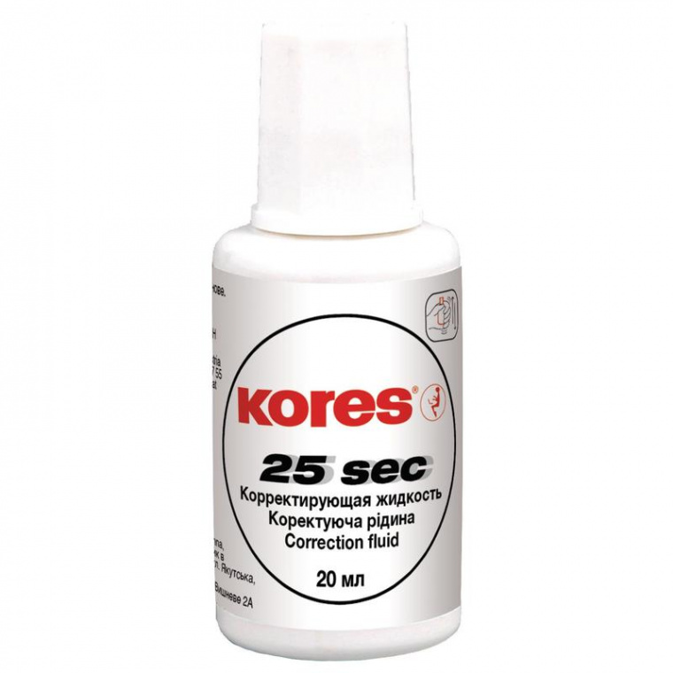 Корректирующая жидкость Kores на спиртовой основе применяется для корректировки всех видов чернил, рукописных и печатных текстов. Полностью закрашивает текст. Ложится ровным гладким слоем, создает непрозрачное покрытие. Имеет быстросохнущую основу. Во флаконе есть металлический шарик (перед использованием рекомендуется встряхивать). Вид кисточки — ворс. Объем флакона с корректирующей жидкостью составляет 20 мл.