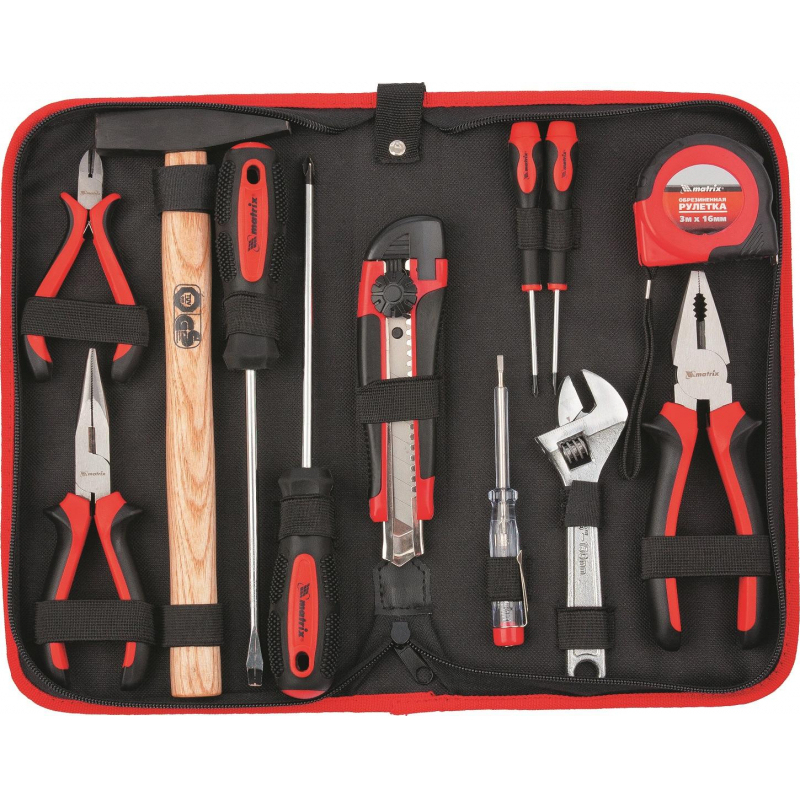 Набор инструмента столярно-слесарный Matrix 12 предметов (13562) укомплектован: длинногубцы, пассатижи, отвертка-тестер (индикаторная отвертка или пробник, предназначенная для определения наличия напряжение на участке сети) , слесарный 200-грамм., молоток, мини кусачки, разводной ключ, технический нож (L=18мм.) , рулетка (13мм. х 3м) , отвертки (мм.) SL (6х150), РН (2х150), РН (00х50), часовые модели (2х50) 2 шт. Набор инструментов используется для мелких ремонтных работ, используется для выявления фазы при электромонтажных работах, ремонте техники. Набор упакован в удобный пенал. Весь инструмент надежно зафиксирован, в таком виде его удобно транспортировать и хранить. Положите компактный пенал в автомобиль и инструмент будет у вас всегда под рукой.