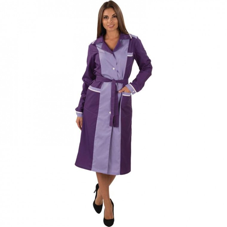 Женский халат для горничных и уборщиц У09-ХЛ, размер 52-54, рост 170-176. Цвет: фиолетовый со светло-сиреневой и белой отделкой. Халат полуприлегающего силуэта, длиной ниже колен. Застежка на петли и пуговицы. Стильный и элегантный халат с английским воротником, рукав длинный, с манжетой, карманы накладные, пояс вокруг талии. Халат изготовлен из смесовой ткани Ти-Си, состав — 65% полиэфира и 35% хлопка. Ти-Си — материал, приятный на ощупь, гигиеничен и долговечен. Не мнется, легко и быстро стирается, быстро сохнет. Долго сохраняет свой первоначальный яркий цвет. Ткань «„дышит“», благодаря входящему в состав хлопку, имеет повышенный срок службы и проста в уходе, благодаря полиэфиру. Плотность ткани 120 г/м квадратный. Униформа рекомендована для сферы обслуживания, клининга, гостиничного бизнеса.