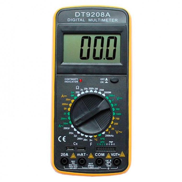Мультиметр предназначен для измерения тока, напряжения, сопротивления, параметров диодов и транзисторов, а также частоты и температуры. Прибор многофункционален, портативен, питается от химических источников, удобен при ремонте электрооборудования автомобиля, лабораторных измерений и т. д. Тип элемента питания - крона. Комплектация: 1 батарейка типа "Крона" 9 В, 2 измерительных щупа, термодатчик, инструкция, коробка.