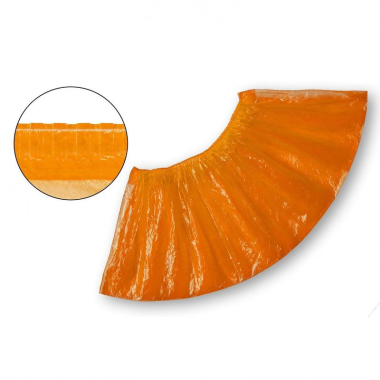 Бахилы (чехлы для обуви) нестерильные полиэтиленовые. Текстурированные, обеспечивают антискольжение. Оранжевого цвета. 2,8 г. В упаковке 50 пар (100 шт бахил). В транспортной коробке 3500 пар. В дополнение к ним можно приобрести одноразовый халат Кимоно (материал спандбонд), так же оранжевого цвета, артикул 552883. Допустимое отклонение от заявленных параметров +/- 10%
