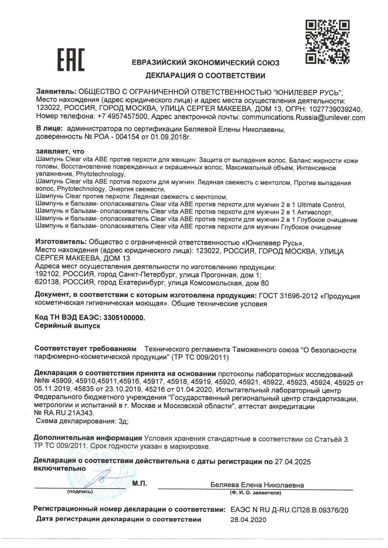 Сертификат на товар - Шампунь Clear Vita Abe против перхоти и выпадения волос для мужчин 400 мл