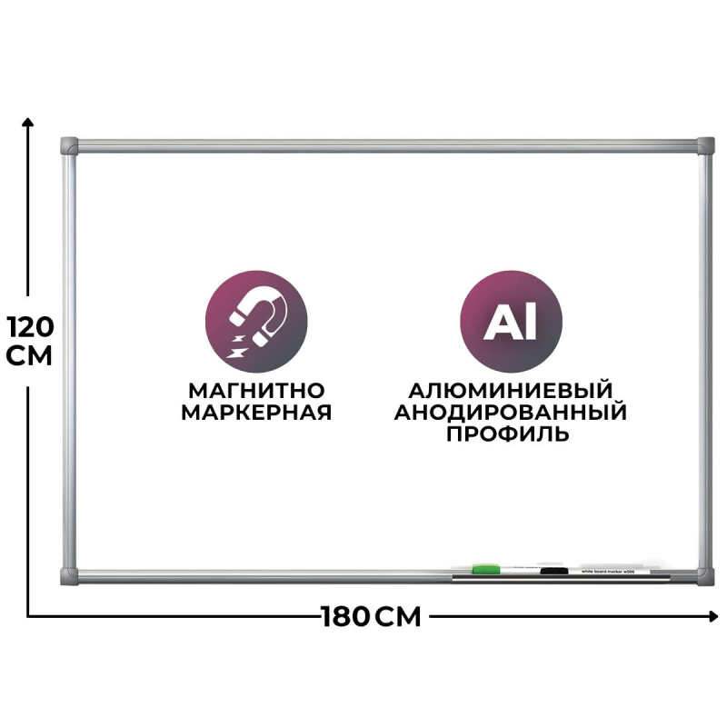 Доска настенная магнитно-маркерная лаковое покрытие в алюминиевом анодированном профиле. Основа доски ДСП 10 мм. Крепление закрытого типа 4-х точечное по углам доски. Набор крепежа и полочка для маркеров в комплекте. Для письма использовать специальные маркеры для магнитно-маркерных досок. при удалении записей используются только специальные губки-стиратели в комбинации со специализированным спреем, для более тщательной очистки полотна. Упаковка - деревянная рейка и оргалит. Размер доски 1200x1800 мм. Габаритный размер (вместе с рамкой) - 24x1830x1220 мм. Гарантия 1 год. Соблюдение правил ухода и эксплуатации способно обеспечить срок службы рабочей поверхности магнитно-маркерной доски более 10 лет. Страна производитель Россия. За счет использования премиум профиля овального сечения шириной 21 мм конструкция доски имеет увеличенную прочность и надежность. Размер рабочей поверхности: 117x178 см. Для удаления пленки потяните за верхний свободный угол, пленка легко отойдет от рабочей поверхности. При необходимости проведите вдоль рамы канцелярским ножом.