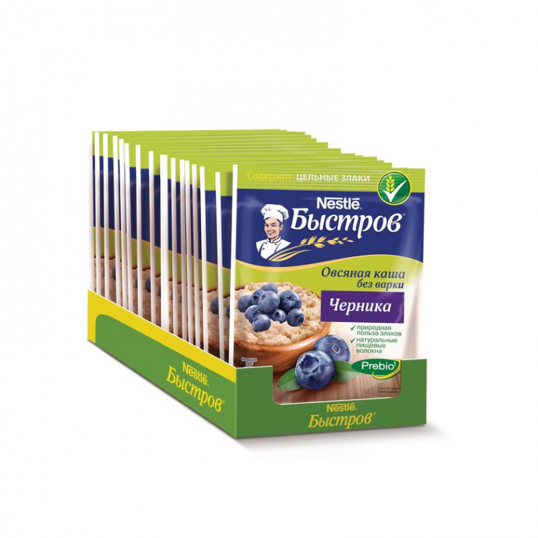 «Овсяная каша с черникой Быстров. Состав: овсяные хлопья, сахар, черника, инулин (натуральный пребиотик), соль, ароматизатор (черника). Продукт может содержать незначительное количество молока, орехов, сои. Пищевая ценность на 100 гр. продукта (не менее): Белки (в гр): 8,6Жиры (в гр): 4,8Углеводы (в гр): 64 Энергетическая ценность:100 г — 1397 кДж/334 ккал, 40 г — 559 кДж/134 ккалУсловия храненения: от +3 до +18 градусов Цельсия и относительной влажности воздуха не более 75%В упаковке 17 штук по 40 г.