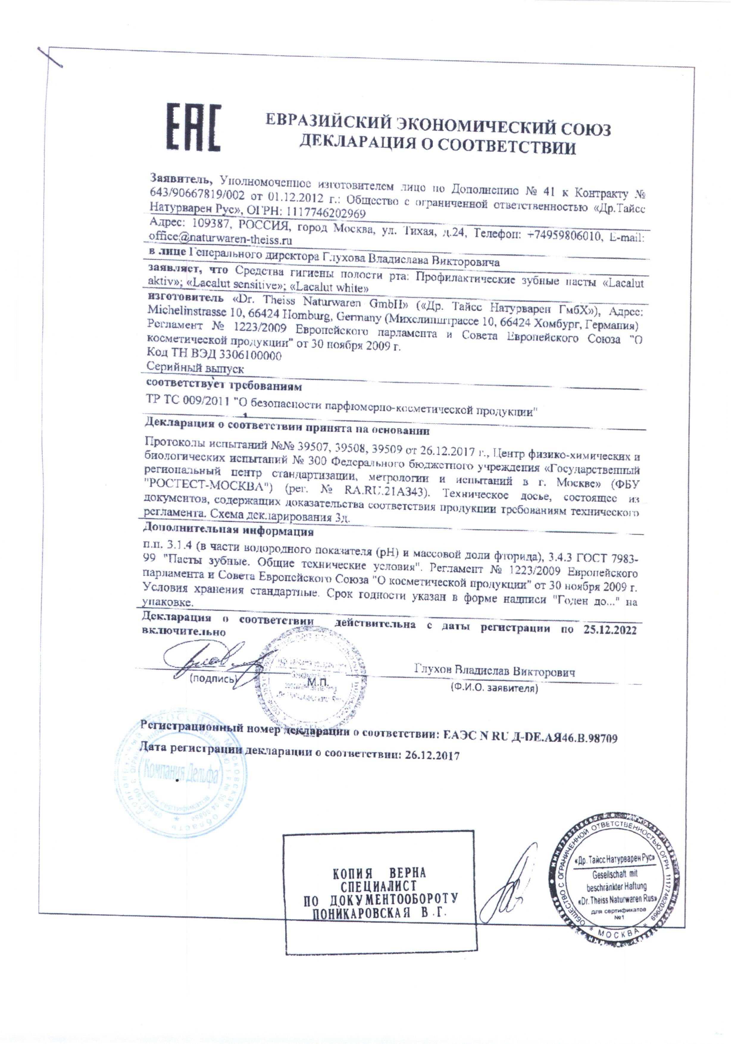 Сертификат на товар - Зубная паста Lacalut Актив 75 мл