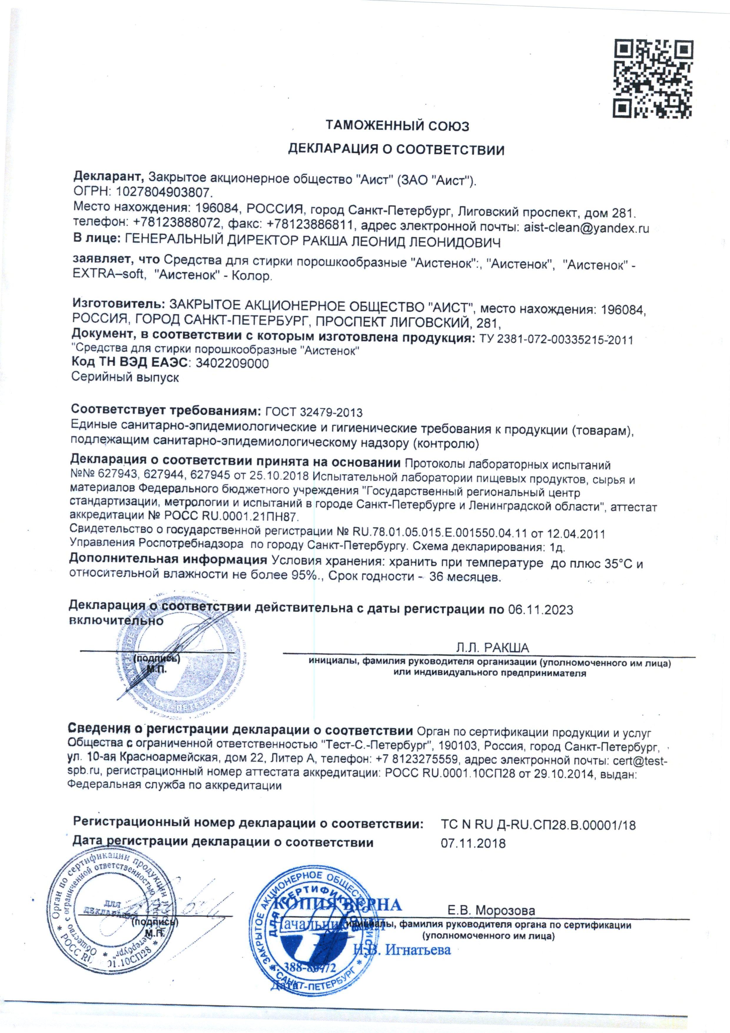 Сертификат на товар - Порошок стиральный автомат Аистенок 2.4 кг (для детского белья)