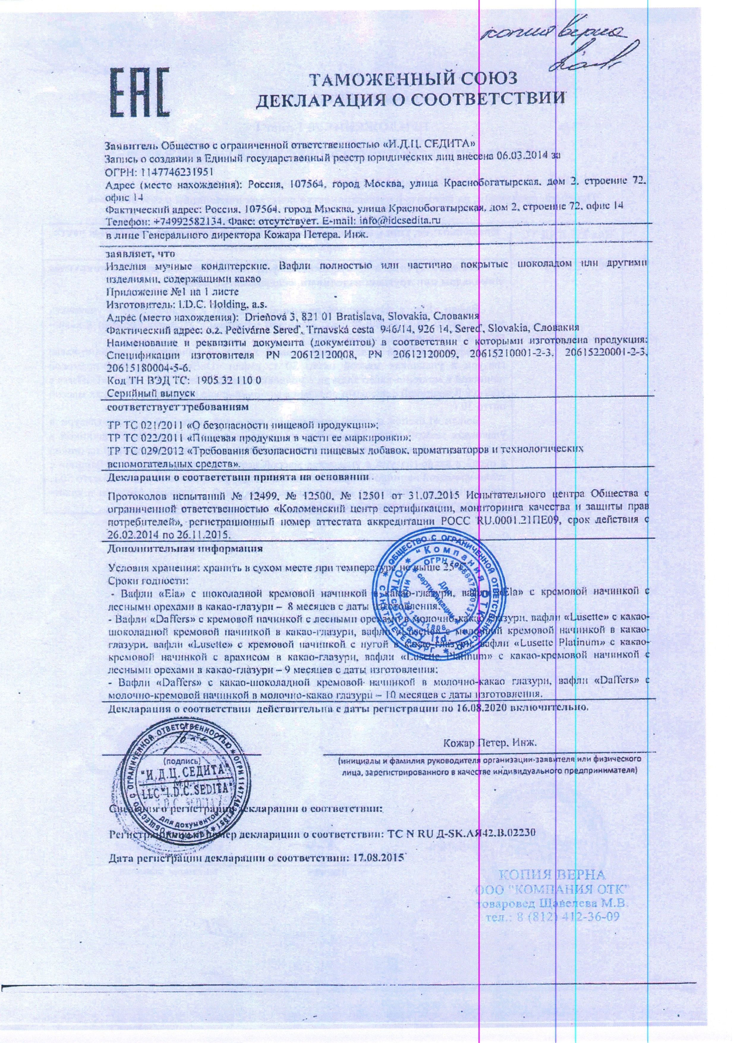 Вафли Daffers с молочно-кремовой начинкой представлены в порционном варианте. Каждая вафля, подобно конфете, имеет отдельную упаковку. Это позволяет использовать их поштучно и брать с собой для утоления голода вне дома. Сладкое и хрустящее угощение пригодится в дороге, на прогулках и в офисе. Ими можно угостить друзей, коллег и положить детям в портфель.