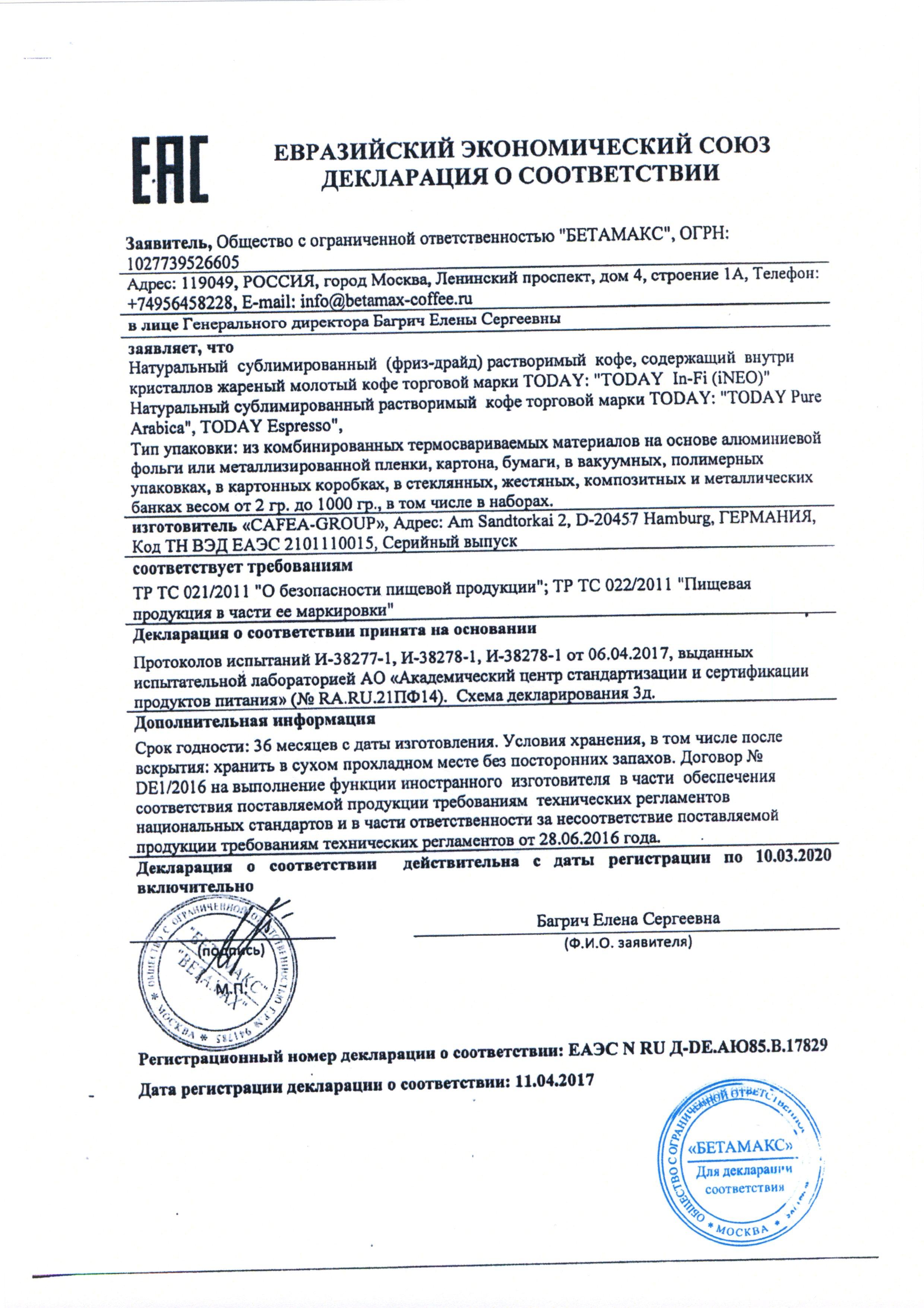 Today Espresso производится в Германии в соответствии с высочайшими стандартами производства ЕС. Его качество подтверждено международными стандартами ISO 9001-2000 и International Food Standard (IFS). Кроме того, независимая экспертиза Law Laboratories Limited высоко оценила систему контроля качества HACCP, соответствующую требованиям BRC Global Standard-Food.