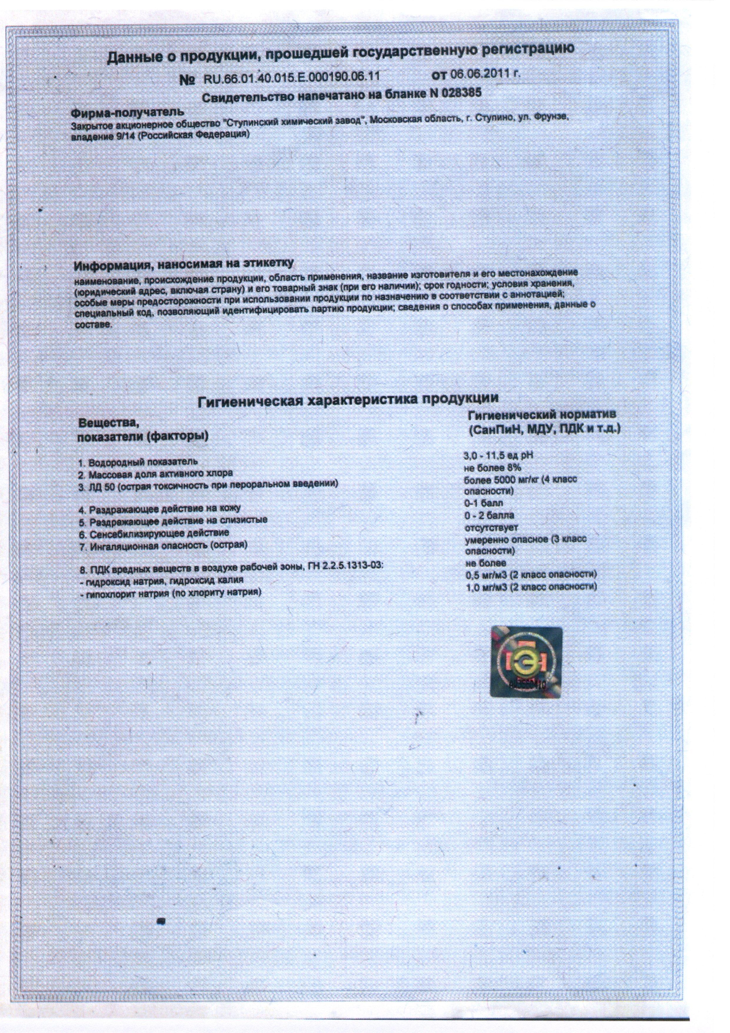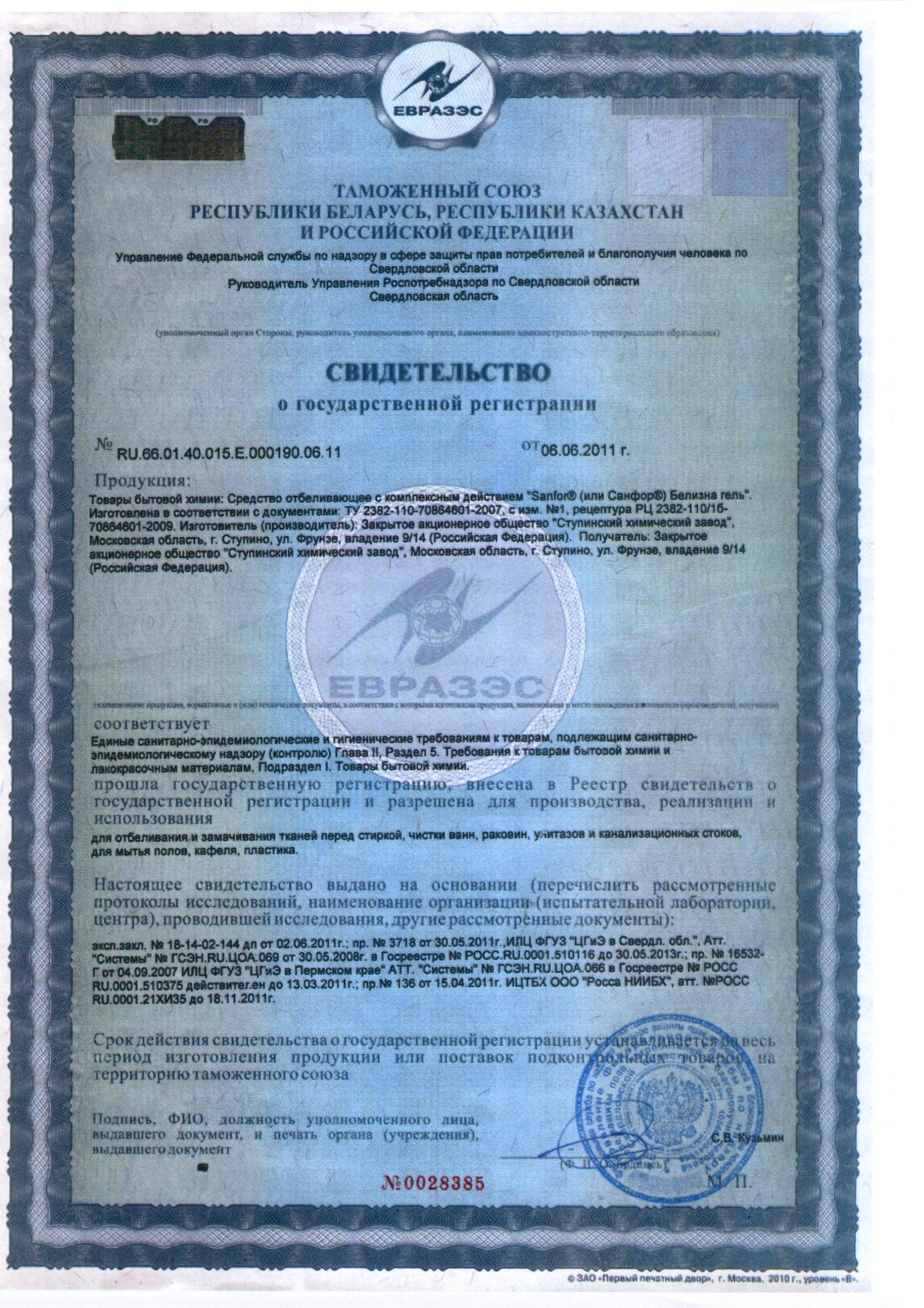 Сертификат на товар - Отбеливатель Sanfor Белизна 3 в 1 гель 700 г