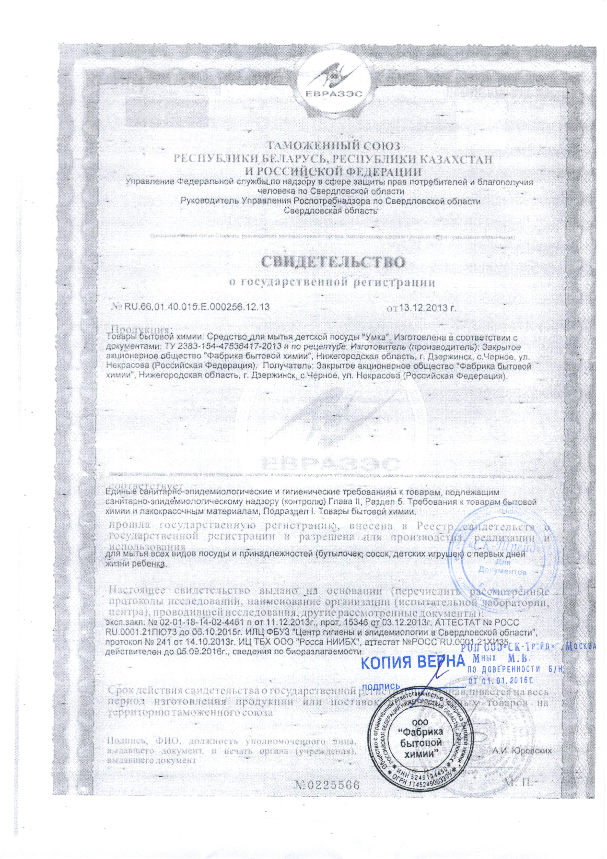 Сертификат на товар - Средство для мытья посуды Умка 500 мл