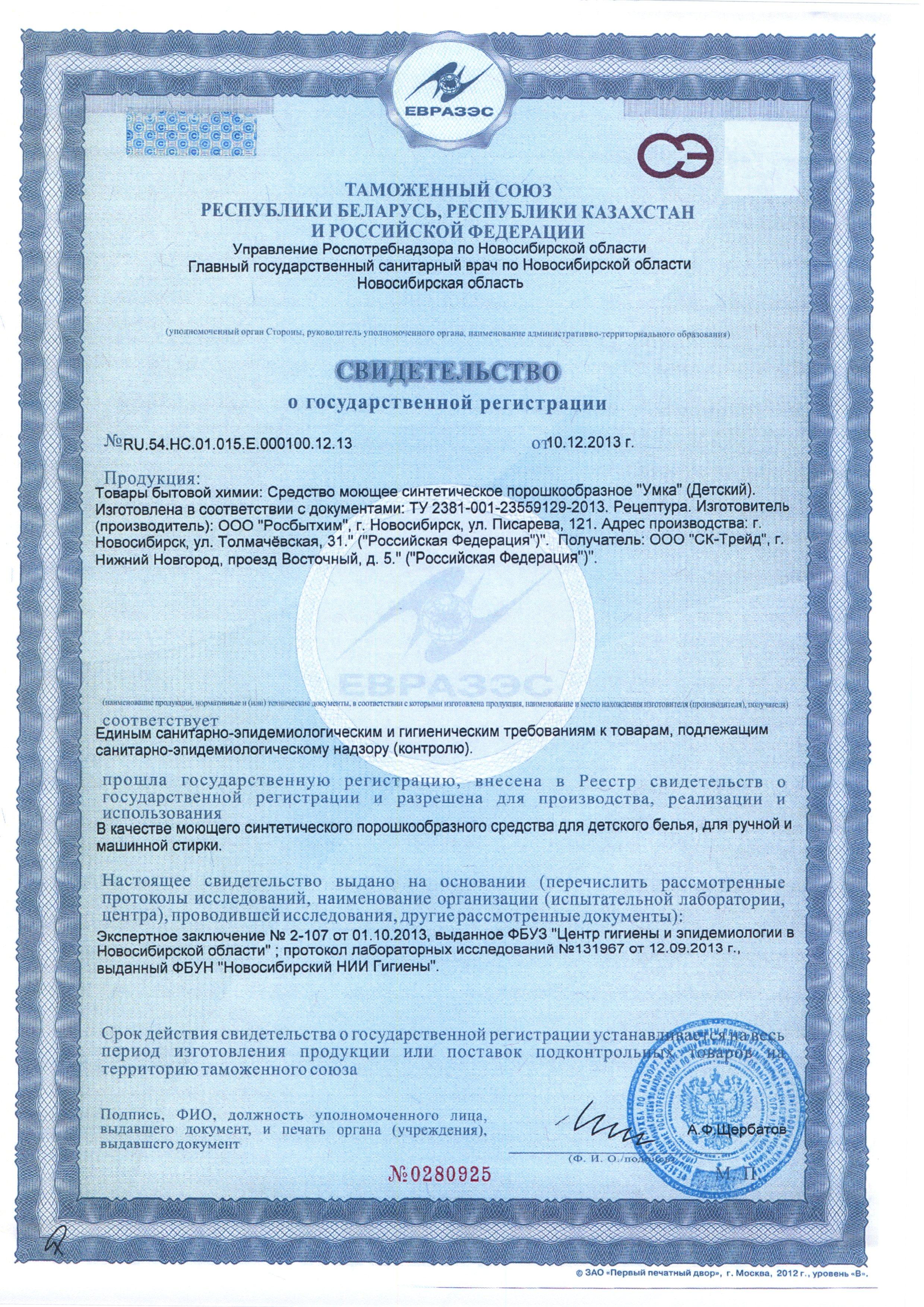 Сертификат на товар - Порошок стиральный автомат Умка 2.4 кг (для детского белья)