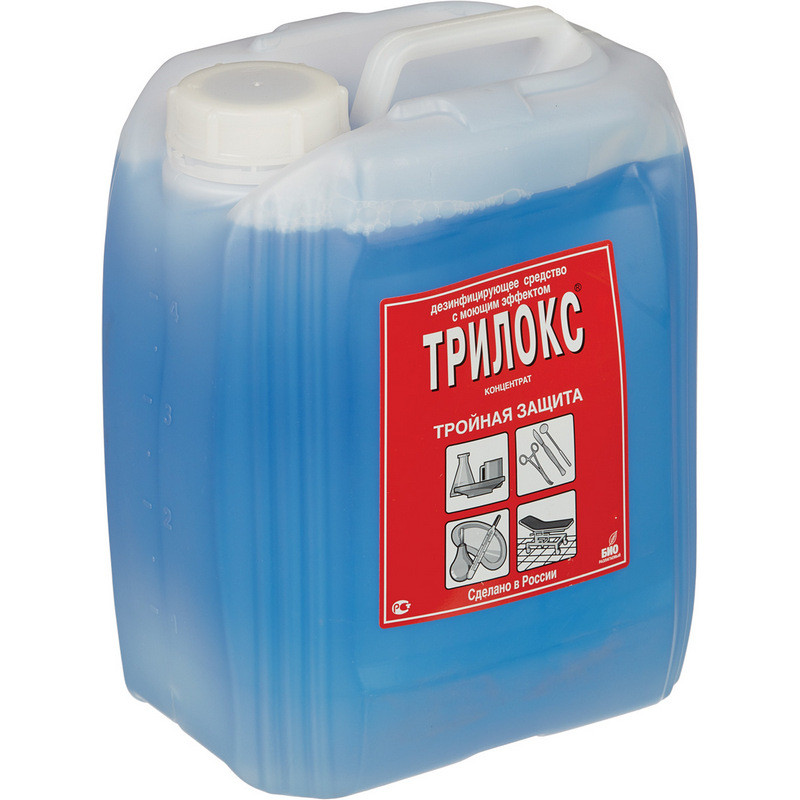 Дезинфицирующее средство 'Трилокс' 5 л (концентрат). Химический состав дезсредства: ЧАС, третичный амин, гуанидин. Действующие вещества: N,N-бис(3-аминопропил)додециламин 3.8 %, алкилдиметилбензиламмоний хлорид (АДБАХ) 3.8 %, полигексаметиленгуанидин гидрохлорид (ПГМГ) 7.5 %. Сфера применения: акушерские стационары, ЛПУ, клинические лаборатории, бактериологические лаборатории, детские учреждения (детсады, школы и т.п.), инфекционные очаги, санитарный транспорт, отделения неонатологии. Объекты обработки: белье нательное, белье постельное, вращающиеся стоматологические инструменты, гибкие эндоскопы, жесткая мебель, жесткие эндоскопы, игрушки, ИМН из металлов, резин на основе натурального и силиконового каучука, стекла, пластмасс, ИМН обычные, ИМН одноразовые перед утилизацией, инструменты к эндоскопам, инструменты стоматологические, инструменты хирургические, кувезы, лабораторная посуда, мед. отходы из текстильных материалов (ватные и марлевые тампоны, марля, бинты), обувь из пластика, резины, одноразовая посуда, поверхности в помещениях, поверхности приборов и аппаратов, предметы для мытья посуды, предметы ухода за больными, резиновые и полипропиленовые коврики, санитарно-техническое оборудование, уборочный инвентарь. Класс опасности: при введении в желудок - 3; при нанесении на кожу - 4; рабочего раствора - 4. Активно в отношении: - бактерии (Mycobacterium tuberculosi, грамотрицательные бактерии, грамположительные бактерии); - вирусы (аденовирусы, атипичной пневмонии, ВИЧ, герпеса, грипп, парагрипп, парентеральных гепатитов, полиомиелит, прочие возбудители ОРВИ, птичьего гриппа (H5N1), ротавирусы, энтеральных гепатитов, энтеровирусы); - возбудители особо опасных инфекций (туляремия, холера, чума); - патогенные грибы (дерматофитон, кандида). Срок годности: в упаковке - 3 года, в рабочем растворе - 14 дней. Страна производства: Россия.