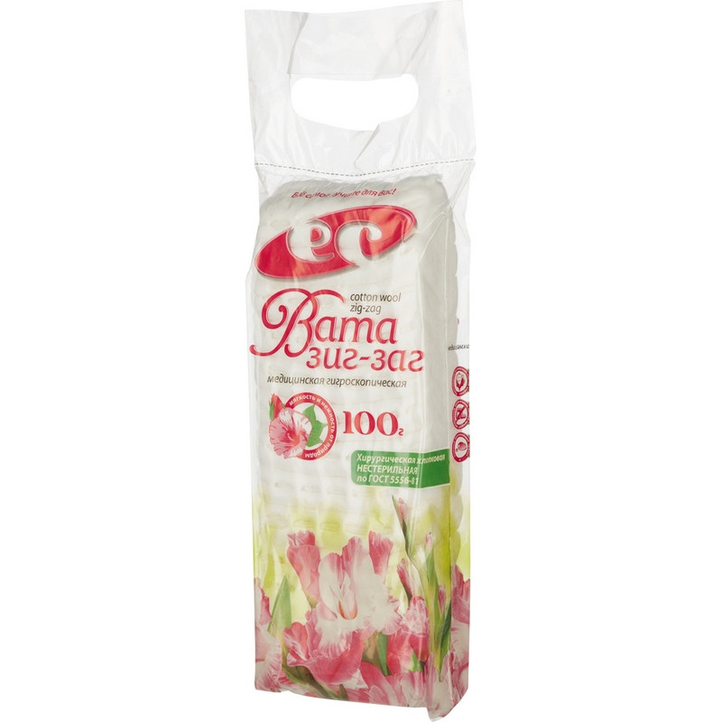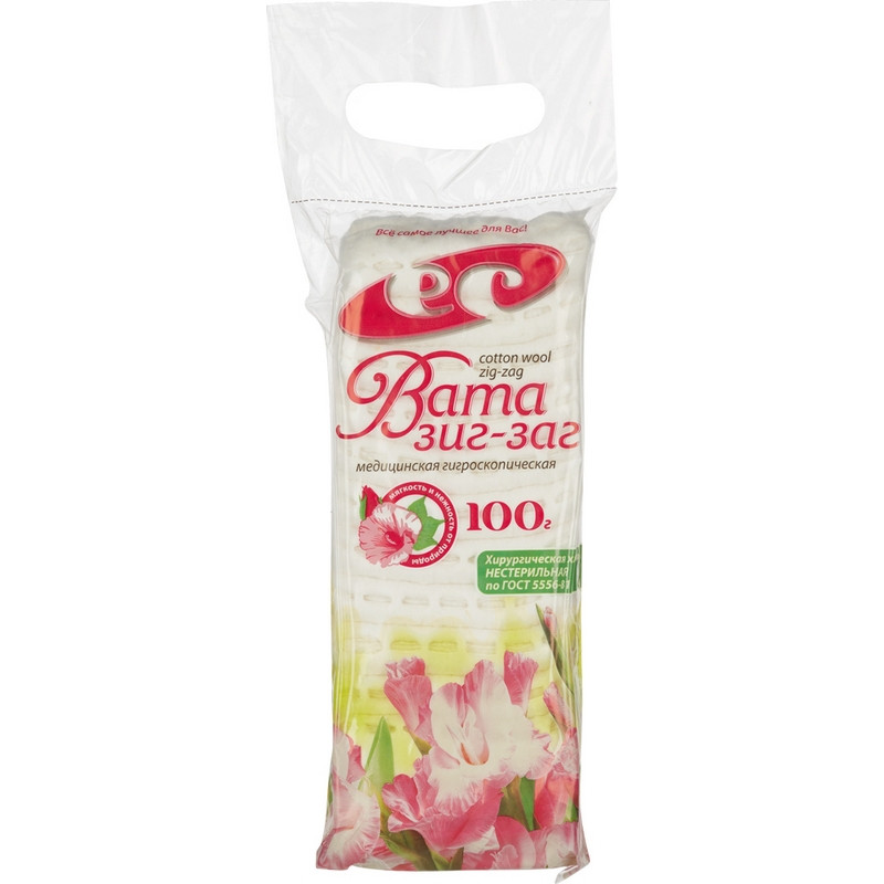 Вата медицинская гигроскопическая хирургическая хлопковая нестерильная по ГОСТ 5556-81 Зиг-Заг. Вата Зиг-Заг хлопковая медицинская гигроскопичная изготовлена из 100% натурального, длинноволокнистого хлопка самого высокого качества - Премиум (в котором полностью отсутствуют ватный пух и любые сорные примеси). В отличие от обычной рулонной ваты, которая скручена в ролик, вата Зиг-Заг прочесана в однослойную ленту и равномерно и удобно уложена в индивидуальную упаковку. При таком особом методе укладки ваты Зиг-Заг, потребитель отрывает нужное количество ваты от ленты, не затрагивая остаток, находящийся в пакете, что позволяет сохранять основную массу от загрязнения, запыленности, инфекции. Сверху на полиэтиленовый пакет нанесена перфорация для удобства открывания.