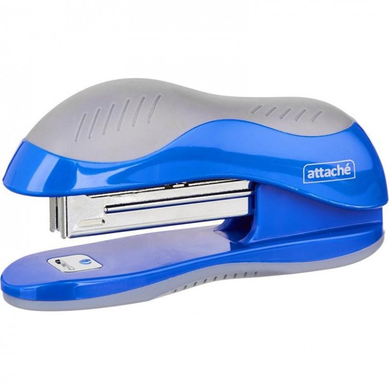 Степлер Attache leader до 15 листов с противоскользящей прорезиненной вставкой, цвет синий с серым. Металлический механизм, встроенный антистеплер. Используемые скобы: № 10. Глубина закладки бумаги 50 мм. Вид сшивания: закрытый. Размер изделия: 113×60×38 мм. Вместимость скоб — 80 штук.