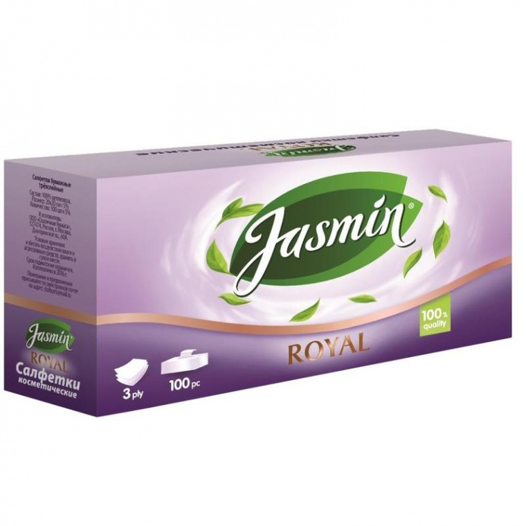 Трехслойные косметические салфетки Jasmin Royal сделаны из 100% целлюлозы. Размер каждой салфетки 20×20 см. Коробка с ПВД-клапаном. В коробке — 100 штук. Размер упаковки — 11,2×7,7×21,1 см.