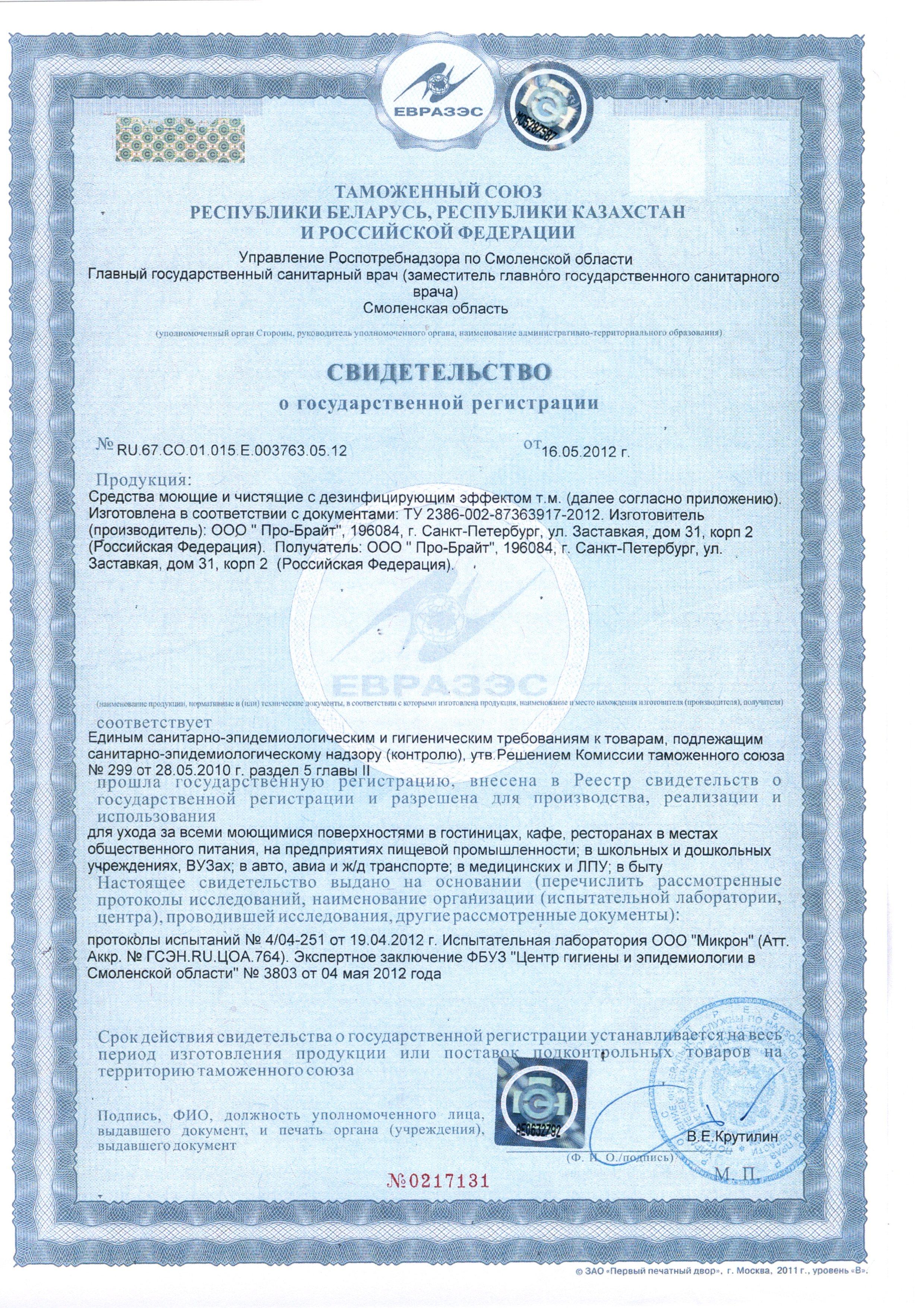 Сертификат на товар - Чистящее средство для кухонных поверхностей Pro-Brite Mario 400 г