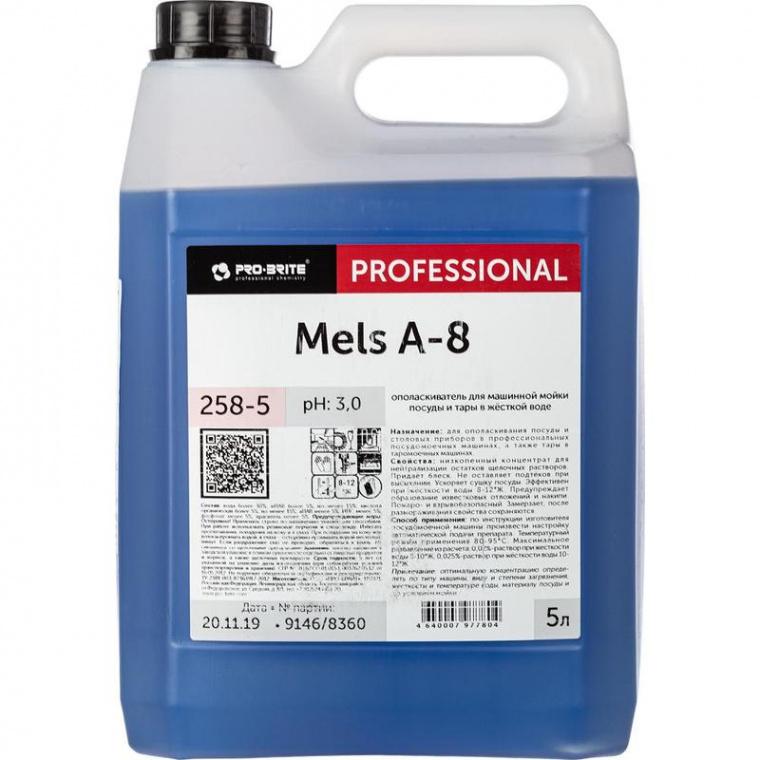 Ополаскиватель для машинной мойки посуды и тары в жёсткой воде Pro-Bright Mels A-8 258-5 5 л