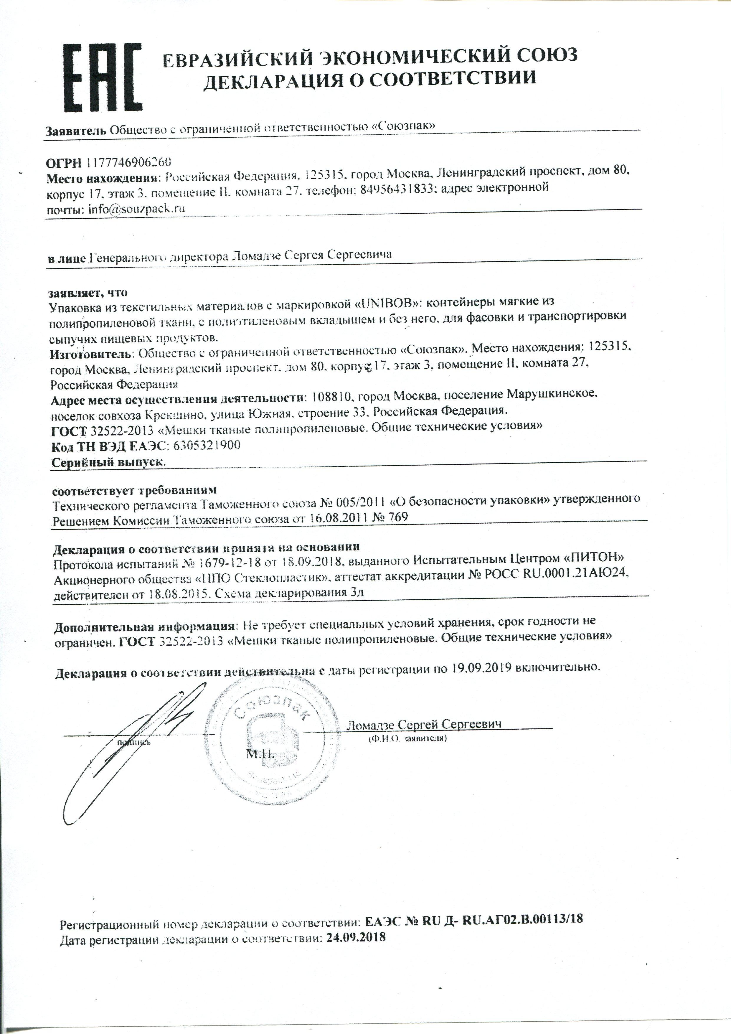 Биг-бэг представляет собой прочный мягкий контейнер из четырехслойного полипропилена с глухим дном и открытым верхом. В разложенном виде имеет размер 75×75×150 см. Оснащен двумя стропами (ручками). Биг-бэг является одним из наиболее экономичных видов упаковки, при этом отличается большой грузоподъемностью и вместимостью. Широко применяется в химической и пищевой промышленностях, сельском хозяйстве, строительстве. Используется для хранения и транспортировки сыпучих грузов (например, цемента, песка, щебня, сахара, муки, зерна), для складирования вторичного сырья, вывоза мусора и т.д.