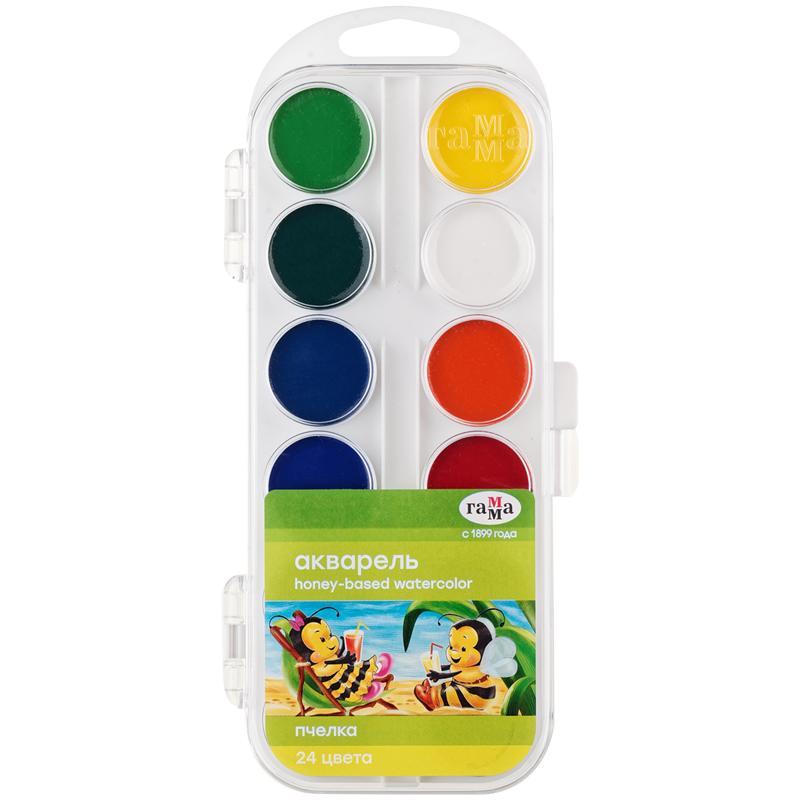 Акварельные медовые полусухие Гамма Пчелка, 24 цвета. Идеально подойдет для детского художественного творчества, изобразительных и оформительских работ. Краски хорошо размываются водой, легко наносятся на поверхность, быстро сохнут. Время, проведенное за рисованием, становится плюсом в копилку детских знаний, а также позволяет сформировать красивый почерк и правильную речь за счет тренировки мелкой моторики рук. Краски на водной основе, безвредны, легко смываются с рук и одежды. В набор входит краска белого цвета. Кисть в комплект не входит. Краски поставляются в пластиковой упаковке. Размер упаковки (ДxШxВ): 210x90x20 мм. Объем краски одного цвета в кювете - 3,5 куб.см.