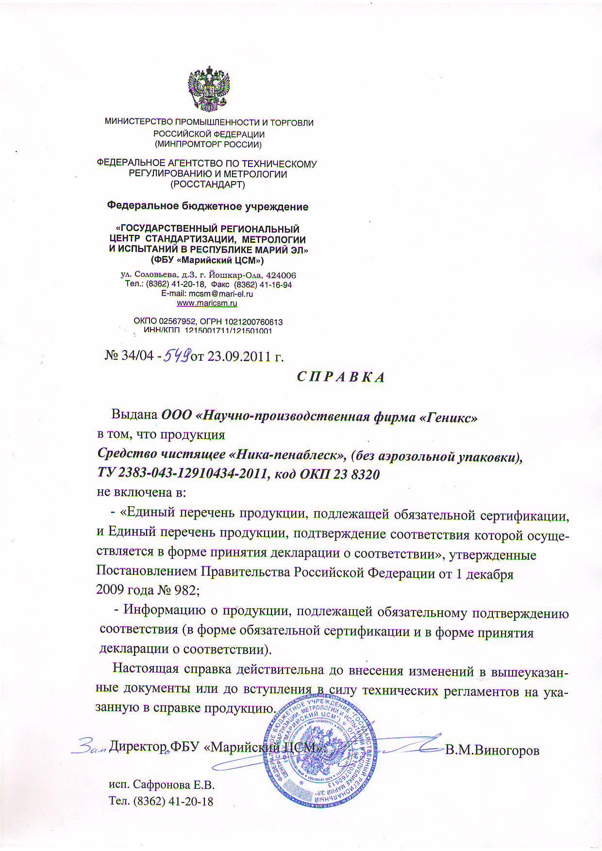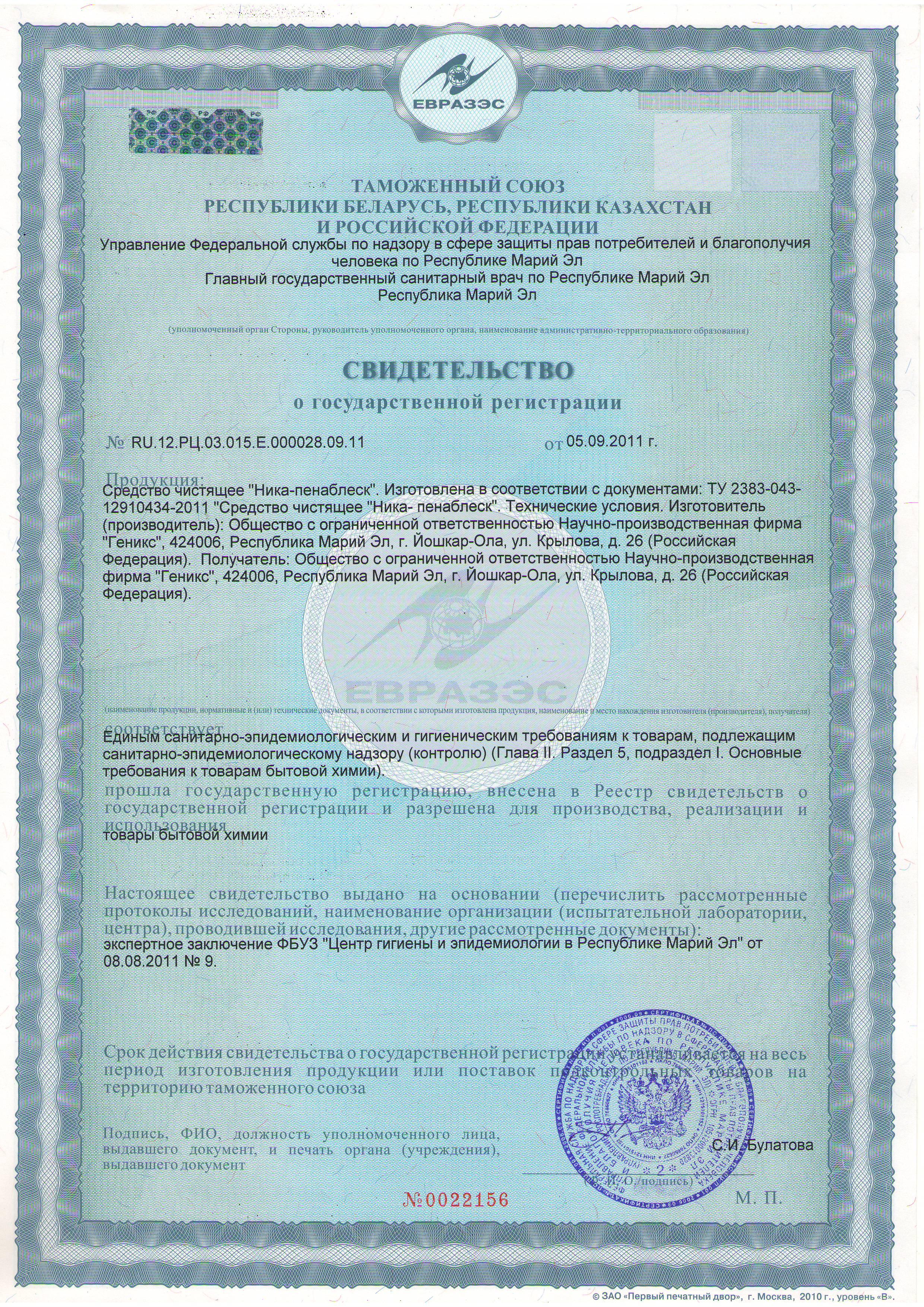 Сертификат на товар - Средство для чистки плит Ника ПенаБлеск 500 г