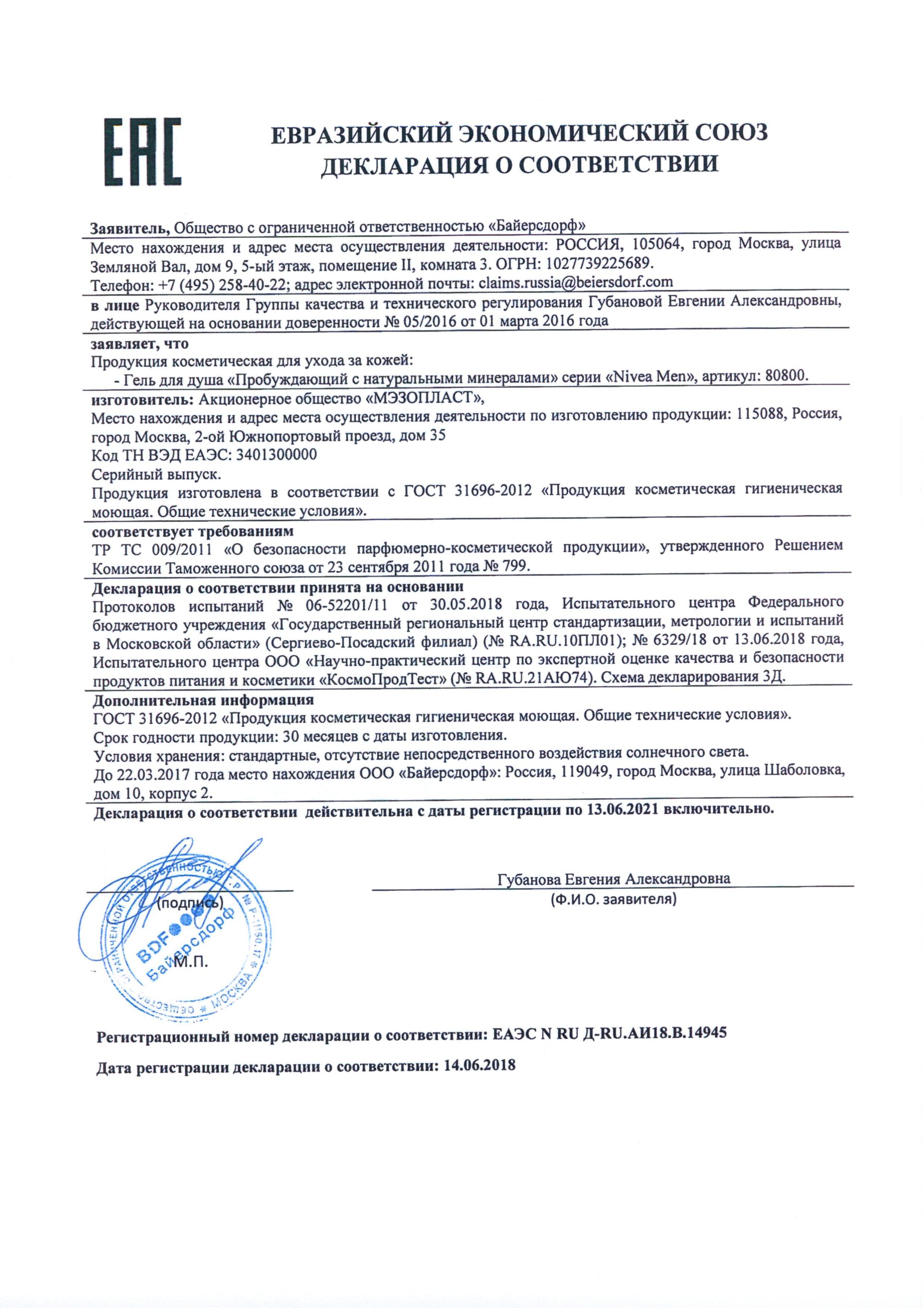 Сертификат на товар - Гель для душа Nivea Пробуждающий 250 мл