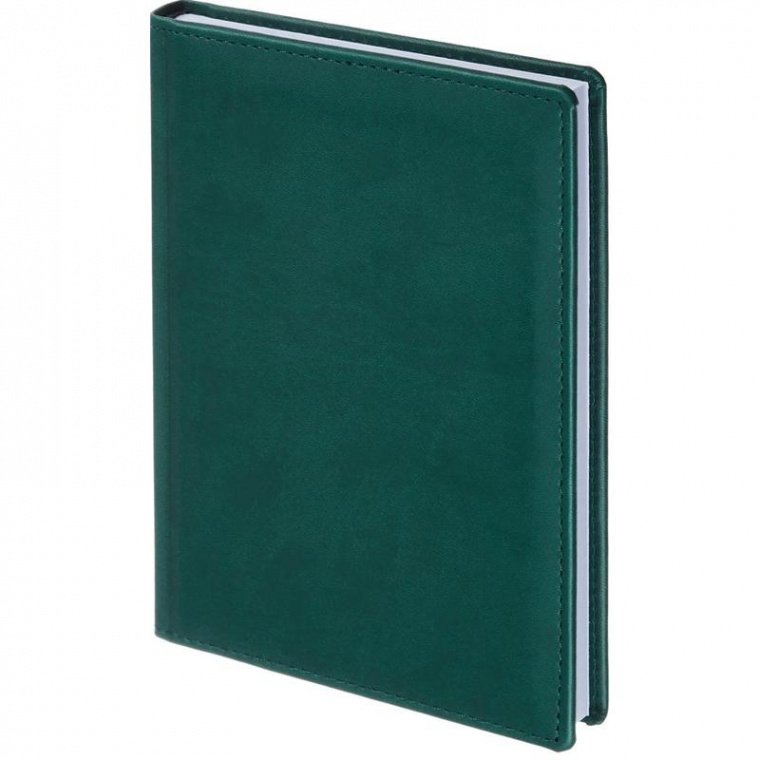 Ежедневник недатированный Attache, цвет зеленый. Коллекция «Вива». Формата А5, размер изделия — 148×218 мм. Однотонная обложка из высококачественного переплетного материала, гладкий матовый имитирующий натуральную кожу, с поролоном, по периметру отделочная строчка в цвет материала. Переплетный материал подходит для любого тиснения (блинт или фольга). Блок: недатированный, белый офсетный блок, плотностью 70 г/кв.м. , 176 листов (352 страницы), оснащен удобной закладкой-ляссе, перфорация уголков, 2 краски. На один день недели приходится отдельная страница. Содержит информационный справочный блок: личные данные, праздники, междугородные телефонные коды России, Москвы, Санкт-Петербурга, Екатеринбурга, знаки зодиака, штриховой код, информации по странам, цифровые годы ГИБДД, форматы бумаги, температура, планы на год.