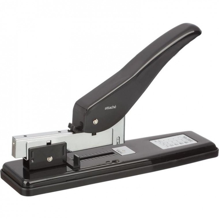 Мощный степлер Attache с максимальной толщиной сшивания бумаги до 85 листов плотностью 80 гр/м2. (до 100 листов бумаги плотностью 70 гр/м2). Глубина закладки листов регулируется от 7 до 60 мм. Пластиковая основа степлера не царапает поверхность стола и предотвращает скольжение. Тип и размер используемых скоб — 23/6 (30 листов), 23/8 (50 листов), 23/10 (70 листов), 23/13 (100 листов). Загрузка скоб в степлер осуществляется горизонтально, вместительность 100 штук. Размер изделия: 295×85×235 мм.