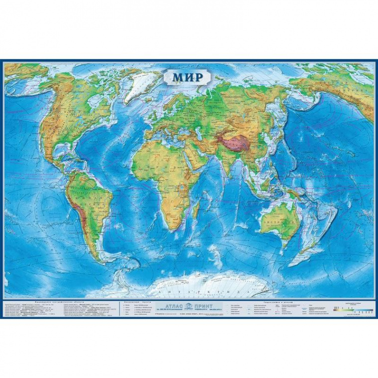 Настенная физическая карта Мира на одном листе. Размер изделия — 1000×700 мм. Карта отпечатана на мелованном картоне. Масштаб: 1:34 000 000. Цветом показан рельеф суши и морского дна. Полиграфия высокого качества. Размер рулона: длина — 0.7 м, диаметр — 0.05 м. Упакован в полиэтиленовый рукав.