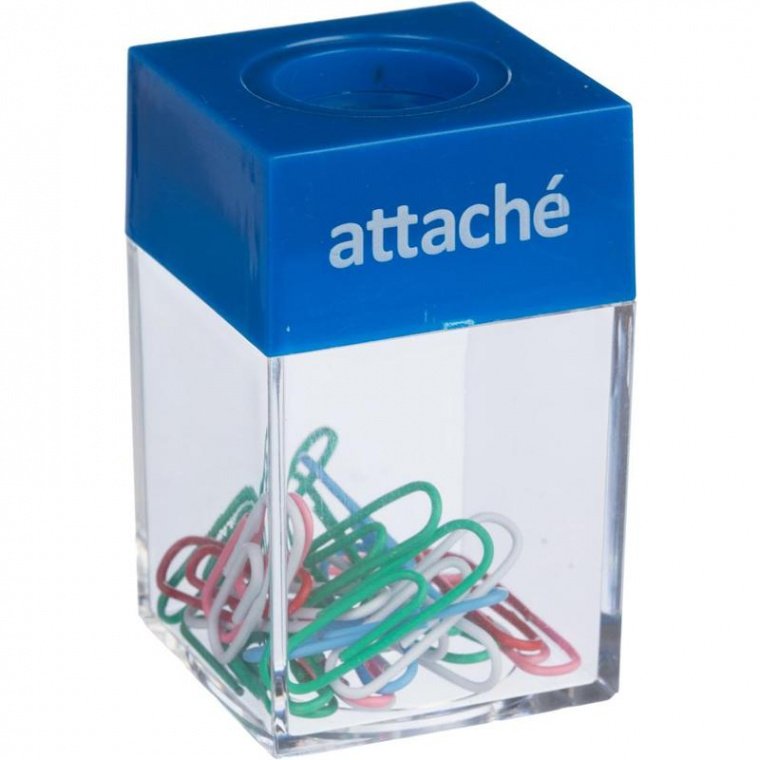 Магнитная скрепочница Attache выполнена в пластиковом корпусе. Имеет прямоугольную форму, размеры — 43×43×68 мм. Состоит из прозрачного контейнера и верхней части. Диаметр отверстия в верхней части — 29 мм. Скрепочница поставляется с разноцветными скрепками (20 штук).