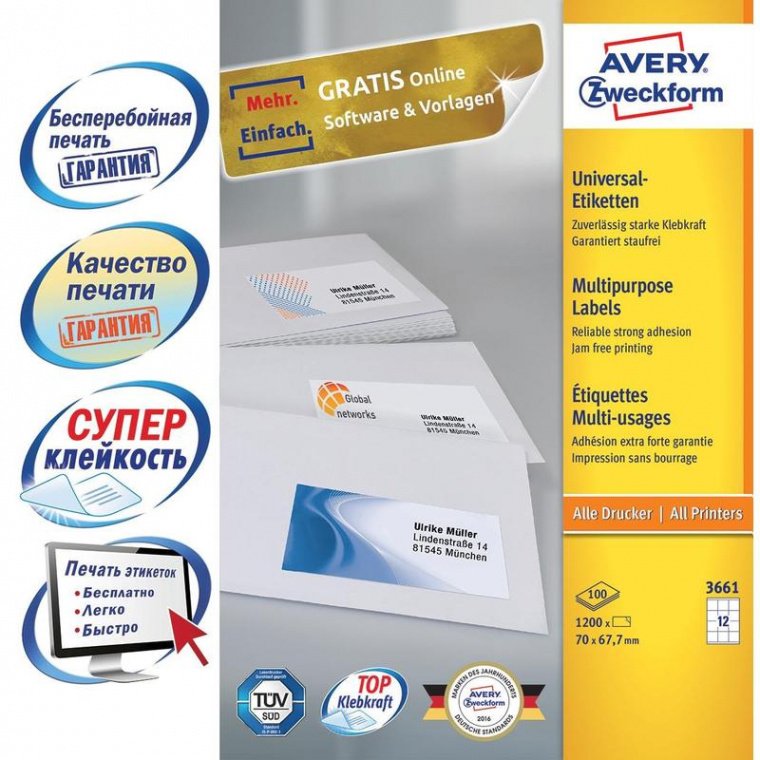 Сертификат на товар - Этикетки самоклеящиеся Avery Zweckform белые 70х67.7 мм (12 штук на листе A4, 100 листов, артикул производителя 3661)
