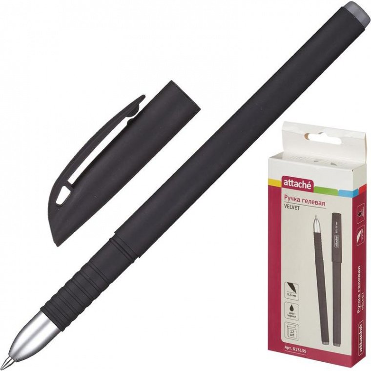 Гелевая ручка Attache Velvet. Приятный на ощупь корпус, выполненный из пластика soft-touch. Стержень с чернилами черного цвета, толщина линии — 0,5 мм. Ручка обеспечивает легкое и мягкое письмо, яркие и насыщенные линии. Чернила быстро высыхают, не размазываются. На самом корпусе нанесен штрих-код.