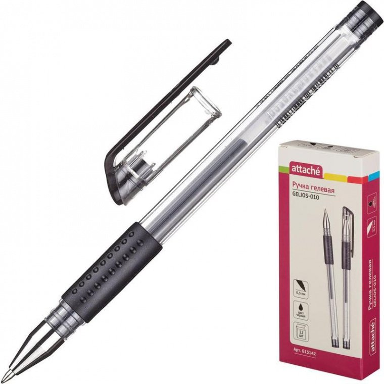 Гелевая ручка Attache Gelios-010 имеет прозрачный пластиковый корпус — удобно следить за уровнем чернил. Удобная резиновая манжетка для снижения напряжения руки. Стержень черного цвета с конусообразным наконечником, толщина линии — 0,5 мм. Чернила быстро высыхают, не размазываются.
