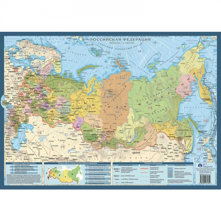 Двухсторонняя карта для школьников. С одной стороны политическая карта мира (1:95 млн), с другой — политико-административная карта Российской Федарации (1:21 млн). Размер изделия: 420×300 мм. Карта отпечатана на мелованной бумаге и покрыта тонкой антибликовой пленкой со стороны изображения. Территория разделена четкими границами по федеральным округам, дополнительно цветом обозначены области с административными центрами. Населенные пункты отмечены с учетом количества проживающих жителей.