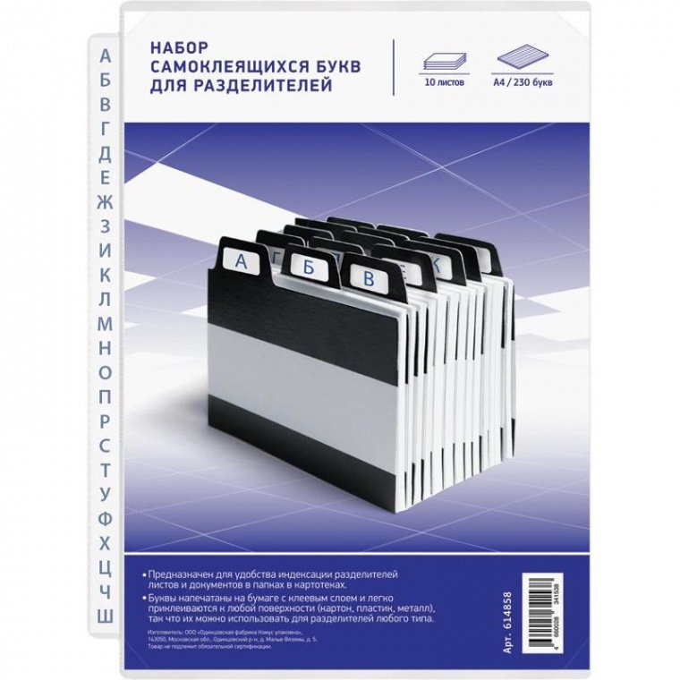 Набор состоит из 10 листов бумаги с клеевым слоем, на каждом из которых — 230 букв. Предназначен для аккуратного нанесения буквенных значений на выступающие ярлычки разделителей в папках и картотеках. Буквы легко приклеиваются к различным поверхностям (картон, пластик, металл), поэтому их можно использовать для разделителей любого типа. Цвет фона — белый, цвет букв — синий.