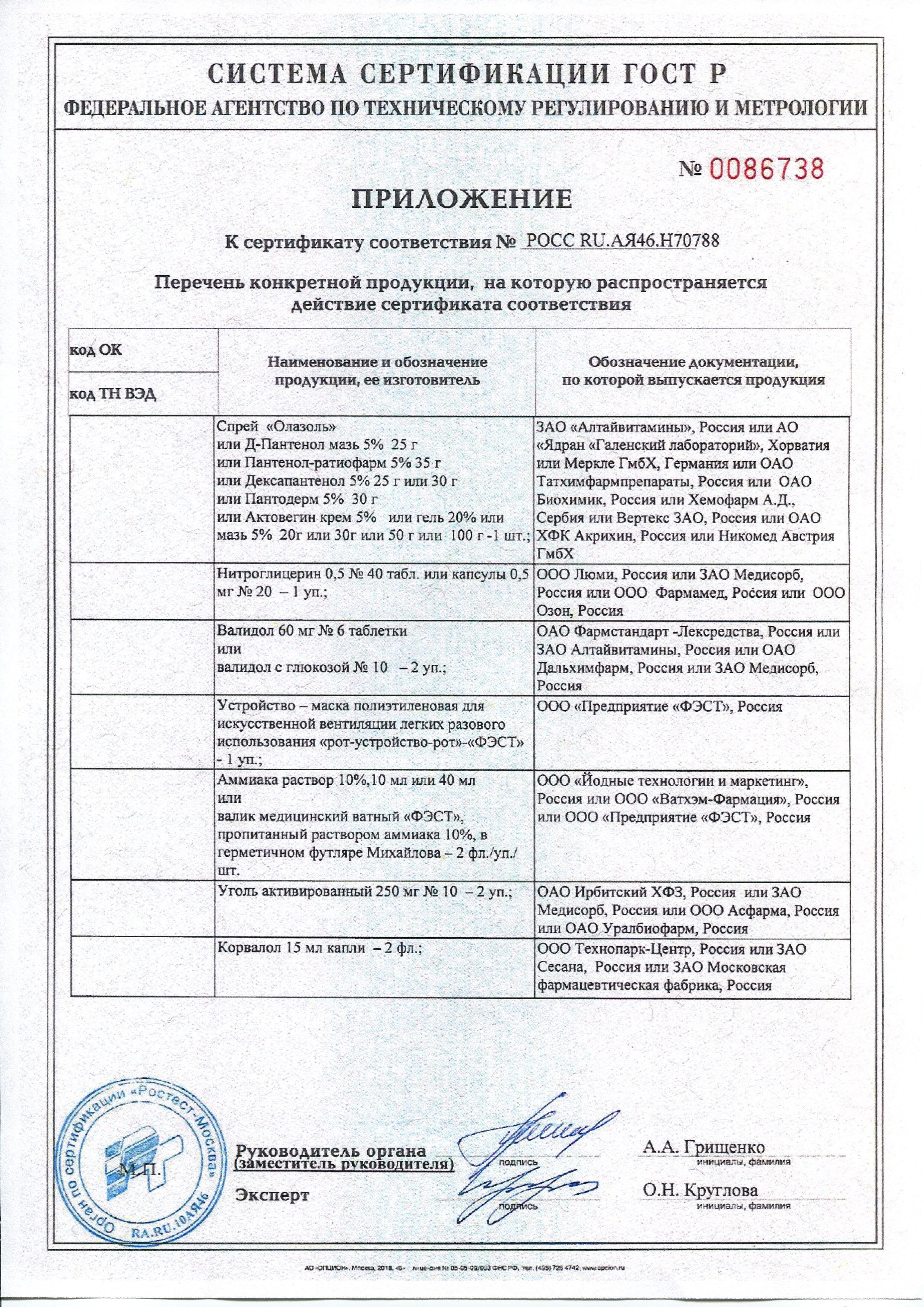 16. Спрей «Олазоль» или Д-Пантенол мазь 5%, 25 г или Пантенол- ратиофарм 5% — 35 г 1 шт.