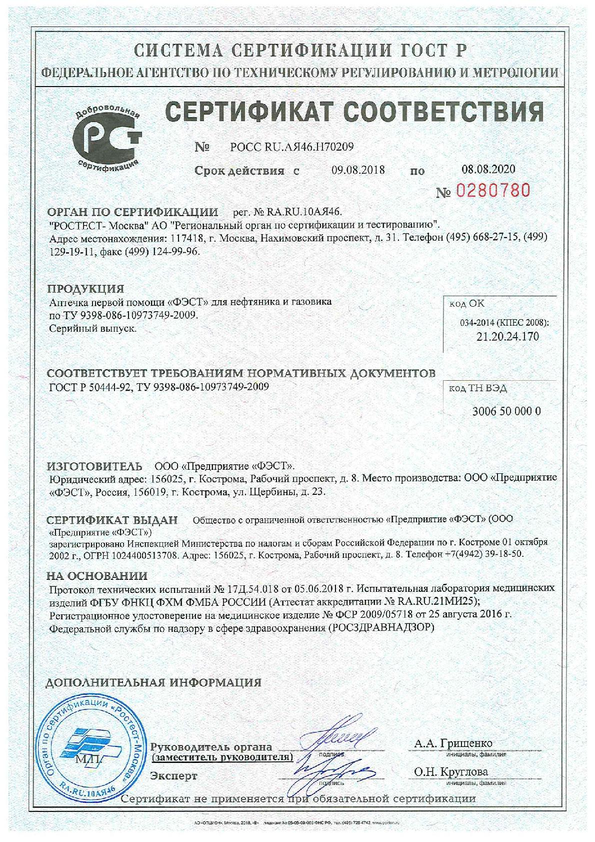 Аптечка первой помощи ФЭСТ для нефтяника и газовика. Аптечка изготавливается в соответствии с ТУ производителя. ТУ 9398-086-10973749-2009 Размер футляра: Футляр — чемоданчик из полистирола 305×265×100 мм Аптечка предназначена для оказания неотложной медицинской помощи работникам нефтегазодобывающей и перерабатывающей отрасли вне медицинских учреждений. № Состав: