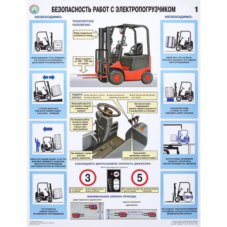 Информационный плакат, наименование по ГОСТу: «Безопасность работ с электропогрузчиками». В комплект входят два листа размером 420×594 мм. Материал изготовления: ламинированная бумага. Страна происхождения: Российская Федерация.