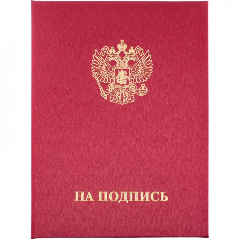Адресная папка формата А4. Выполнена из переплетного материала танго бордового цвета (слой ПВХ на бумажной основе). Внутренние вклейки — из балакрона (ПВХ с имитацией кожи). На обложке надпись «На подпись» и орнамент (тиснение золотой фольгой). Внутри фиксирующий ремешок. Ручная сборка. На данный товар можно нанести логотип. Папка адресная — прекрасный атрибут для официальных и праздничных мероприятий.
