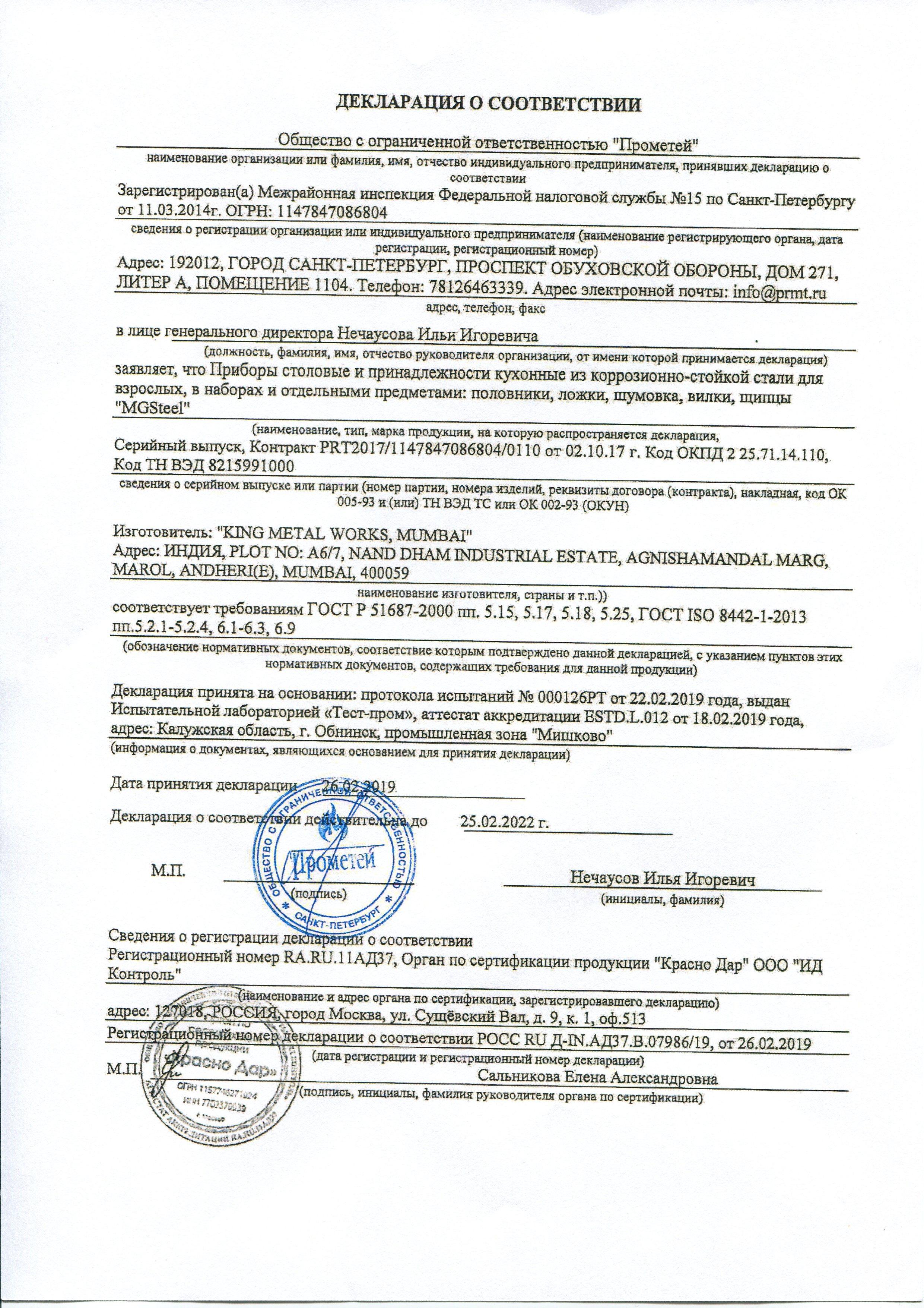 Сертификат на товар - Половник MGSteel нержавеющая сталь 250 мл длина ручки 340 мм диаметр 100 мм (артикул производителя LOPP10)
