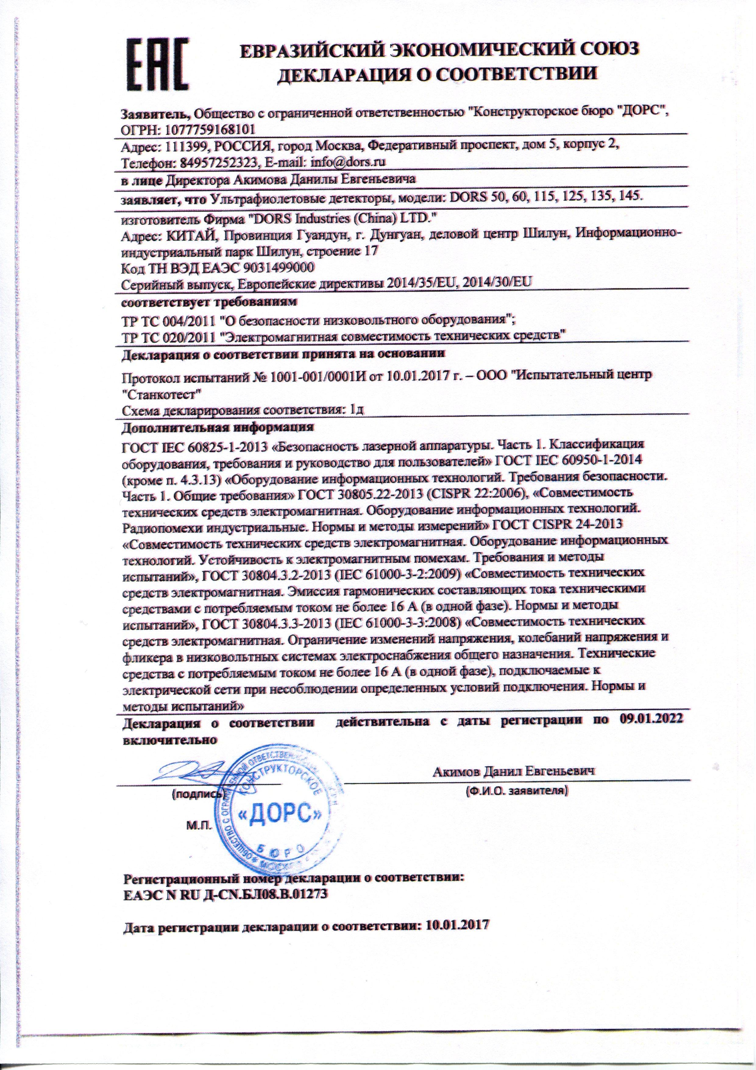 Сертификат на товар - Детектор банкнот просмотровый Dors DORS 125