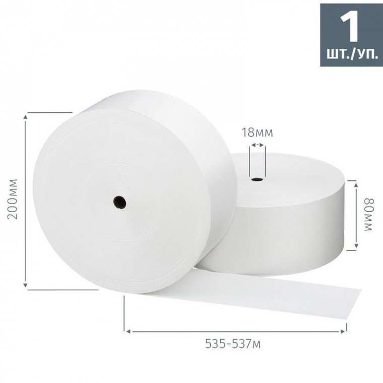 Чековая лента изготовлена из термобумаги. Бумажное полотно с внутренним термослоем имеет ширину 80 мм и общую длину 535-537 метров. Диаметр намотки - 200, диаметр втулки - 18 мм. Поставляются в термоусадочной пленке и гофрокоробах. Ролики для термопечати используются в кассовых аппаратах и калькуляторах со встроенным или внешним термопринтером.