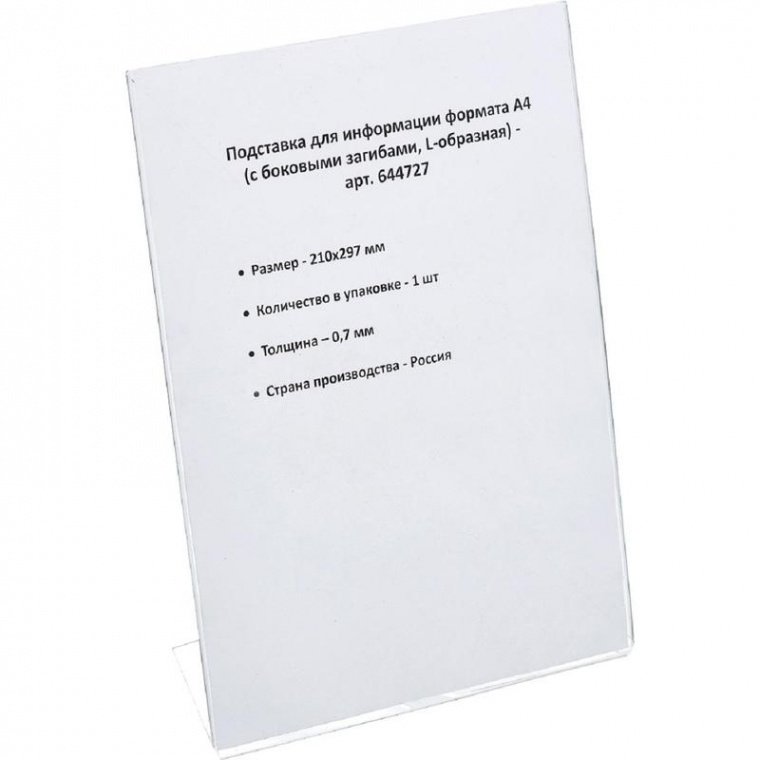 Держатель информации из пластика L-образный, форматы А4. Применяется в качестве держателя ценников и информационного носителя. Высечка ребер жесткости обеспечивают прочность изделия, а боковые загибы плотно удерживают вставленную информацию. Можно устанавливать как вертикально, так и горизонтально.