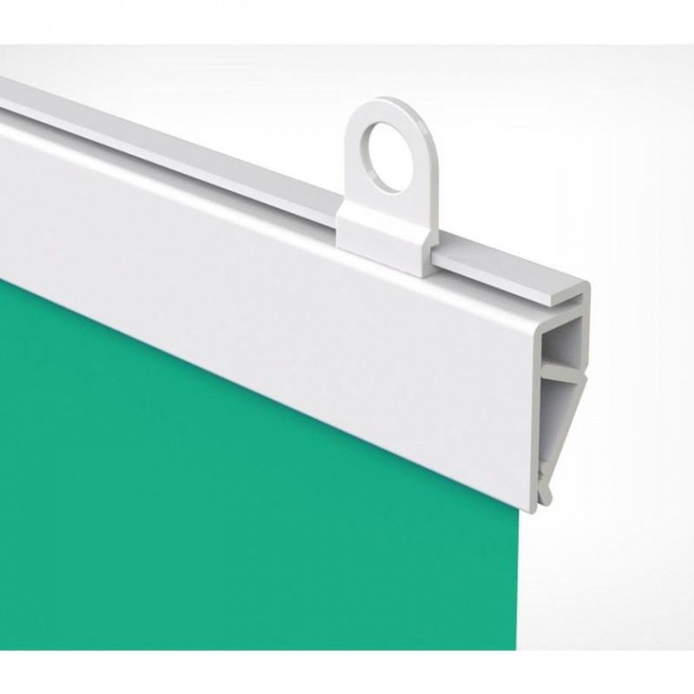 Держатель для плакатов пластиковый предназначен для подвешивания бумажных и тканевых плакатов, тонких баннеров. Размеры — 20×6 мм, длина — 60 см. Максимальная толщина вставки составляет 0,7 мм. В комплекте два клик-профиля и два пластиковых крючка для подвешивания.