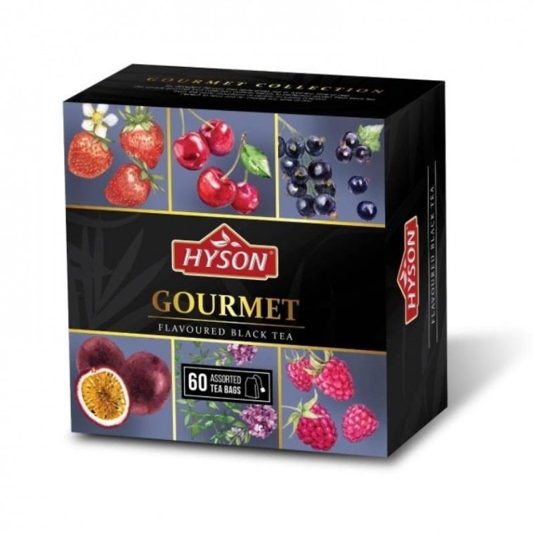 Чай чёрный байховый цейлонский ароматизированный (6 вкусов: Клубника, Вишня, Чёрная Смородина, Маракуйя, Чабрец, Малина) в пакетиках.6 вкусов по 10 пак. Картонная коробка и фольгированный пакет. В то же время, набор из 6 разных вкусов, прекрасный повод познакомиться с линейкой ароматизированного черного чая Hyson, и отличная возможность разнообразить свои чаепития.