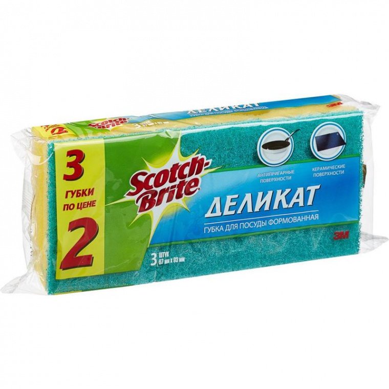 Чистящий слой 3 м деликат: очищает сильные загрязнения и не оставляет царапин на поверхности — подходит для чистки посуды с антипригарным покрытием, для ухода за стеклом, фарфором, керамикой, пластиком, полированными и хромированными поверхностями. Поролоновая основа отлично вспенивает моющее средство. Обеспечивают защиту пальцев и ногтей от повреждений благодаря специальной выемке. Губки долговечны: чистящий слой надёжно склеен с основой, не скатывается, легко промывается, равномерно стирается