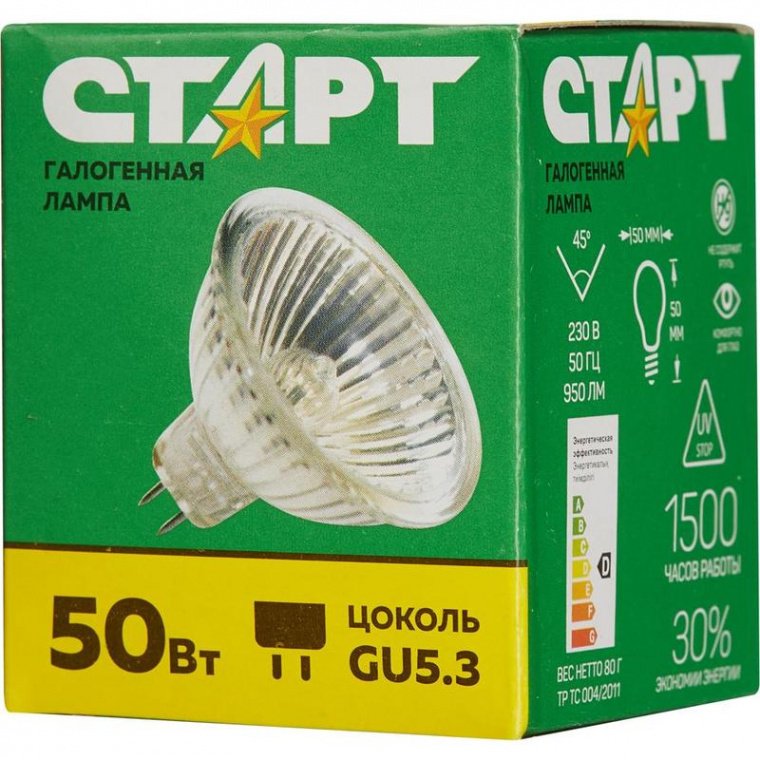 Галогенная лампа Старт имеет зеркальную колбу формы спот. Создает свечение теплого белого цвета. Галогенная лампочка — разновидность ламп накаливания, ее отличительная особенность — добавление в колбу паров галогенов. Мощность лампы составляет 50 Вт, цоколь GU5.3, используется в осветительных приборах, которые подключены к сети переменного тока с напряжением 220 В без применения трансформатора. Средний срок службы ламп — 1500–2000 часов.